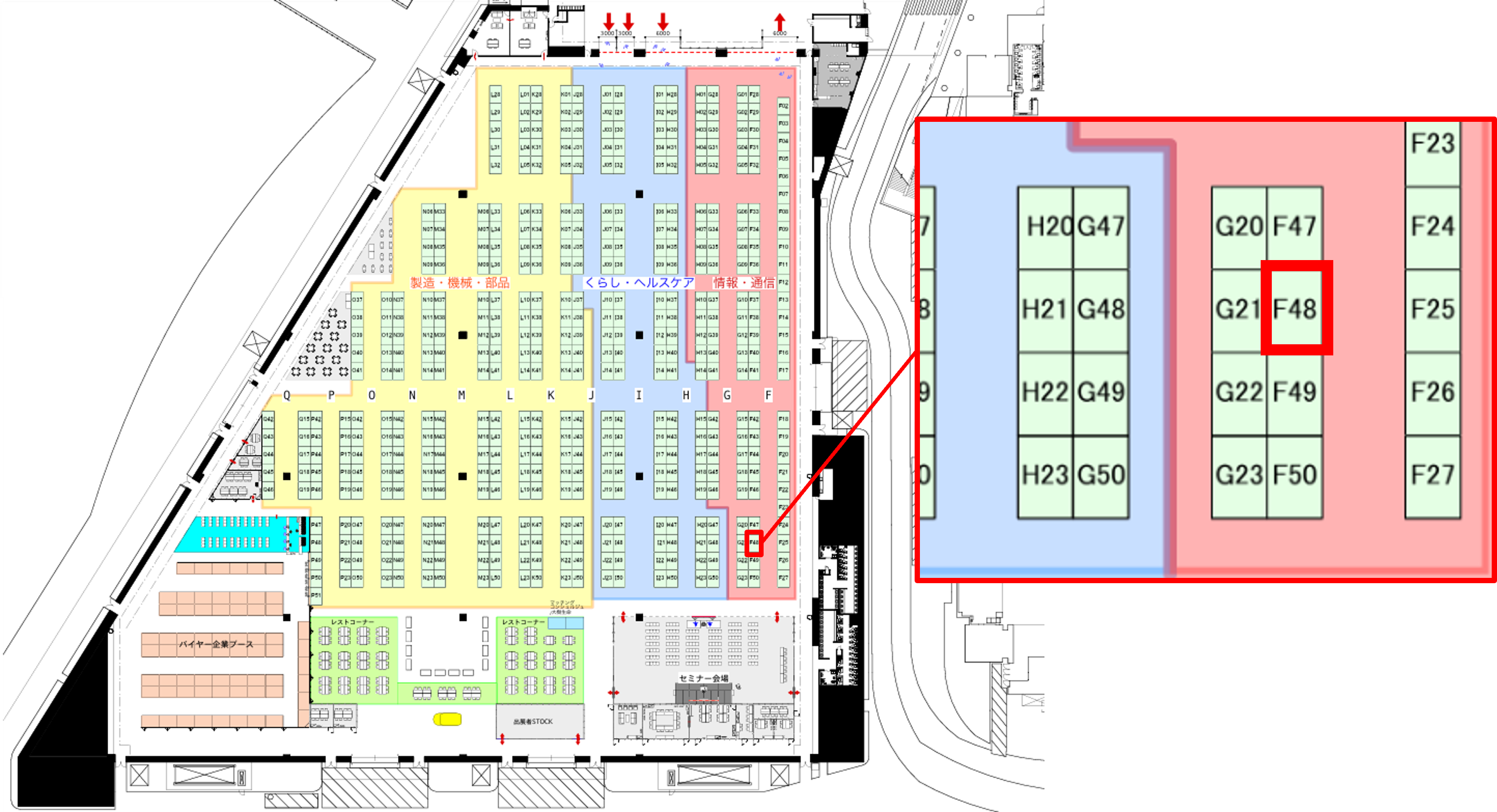ブース位置:情報・通信エリアの一番奥から3番目、セミナー会場入り口の近くです。