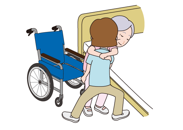 移乗介助の際は、つま先を移乗する方向に向け、身体をひねらず、膝の屈伸を利用して介助します。