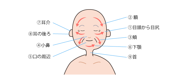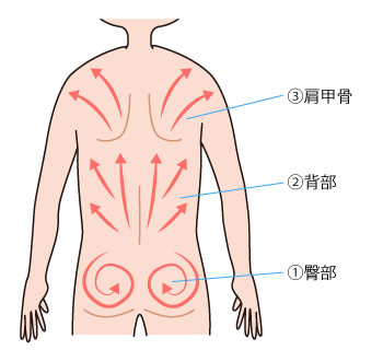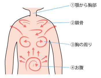 均等の圧力で、同一部位を数回拭きます。筋肉の流れに合わせ、また四肢は末端から中心へ向かって拭きます。