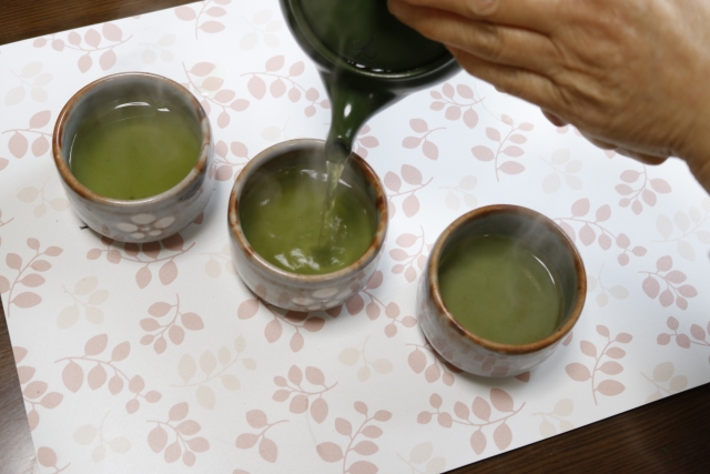 お茶の濃さが均等になるように、湯飲みに注ぐ。