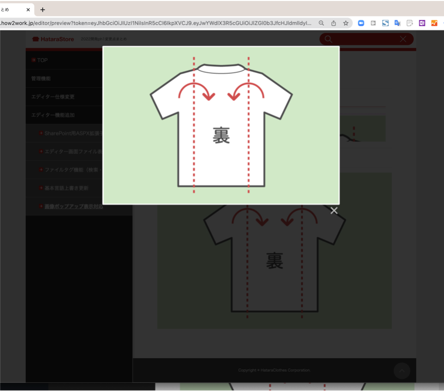 オプションにて「ポップアップ」が選択された場合、出力HTMLに画像の拡大表示機能(サードパーティライブラリ)が適用されます。