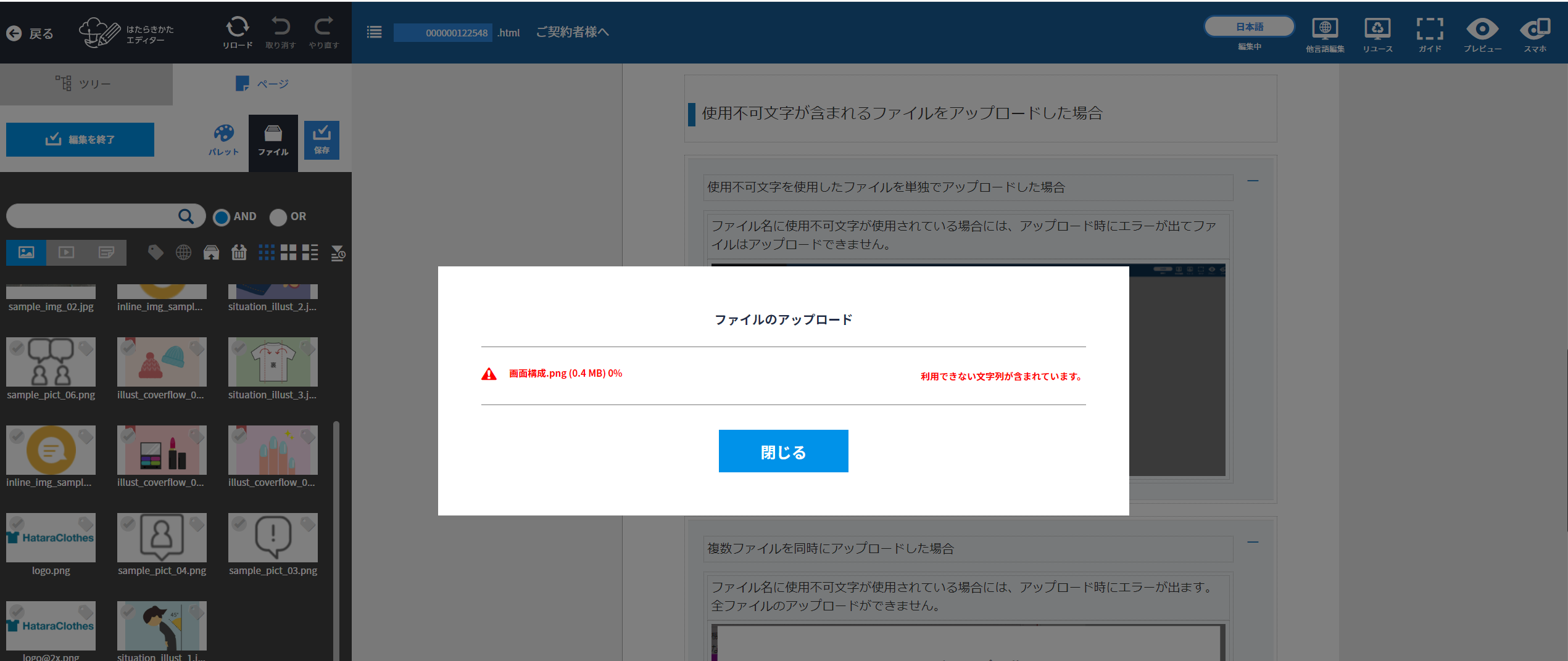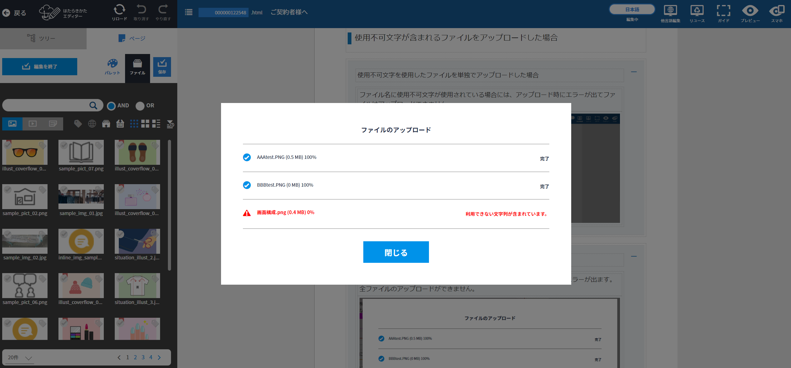 使用不可文字が含まれるファイルをアップロードした場合