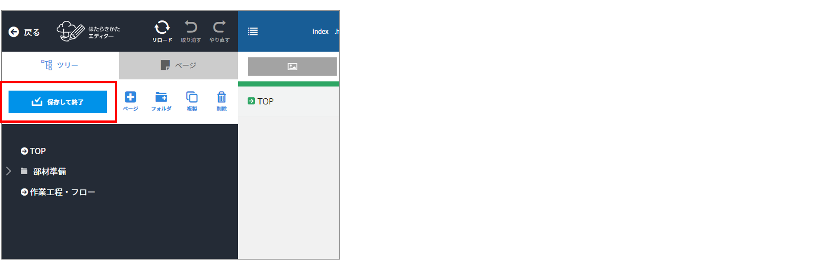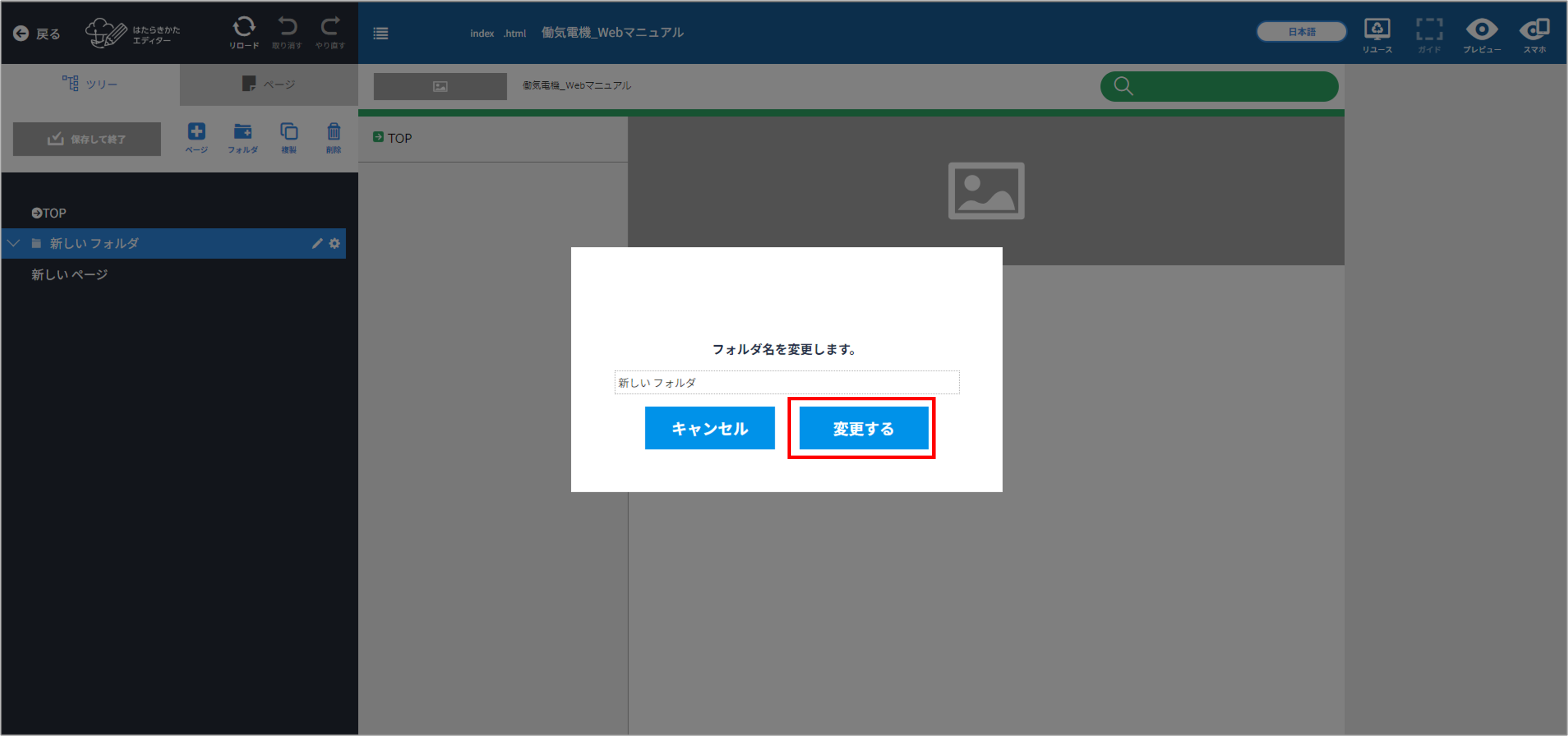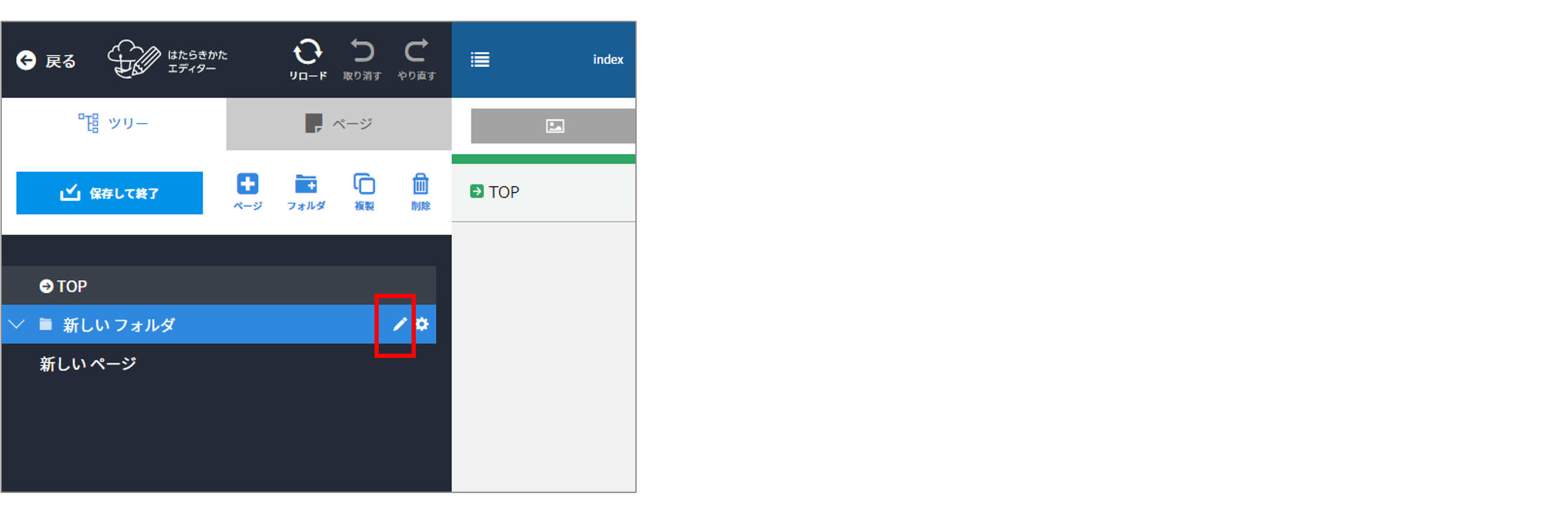 ツリーの入力 ツリーの入力画面が、ポップアップ表示に変更になりました。 ツリーの入力方法 ツリーの入力画面でフォルダまたはページを追加し、鉛筆マークをクリックする 入力画面がポップアップ表示されます。 タイトルを入力し、[変更する]をクリックする ツリーの入力が終わったら[保存して終了]をクリックする