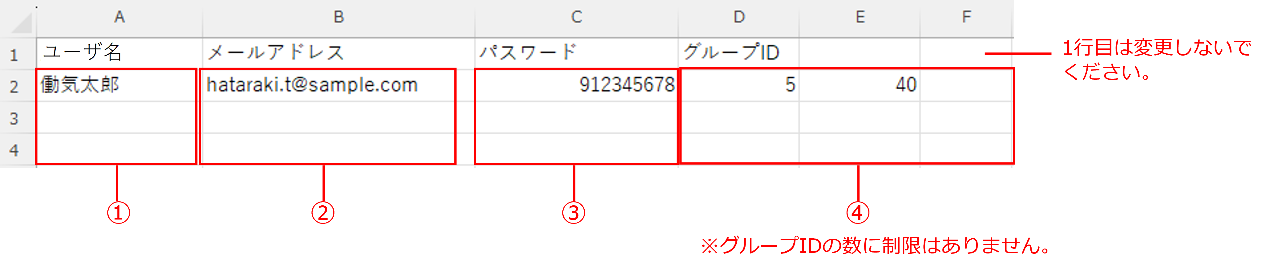 グループIDを複数指定する場合は、E列以降のセルに登録してください。