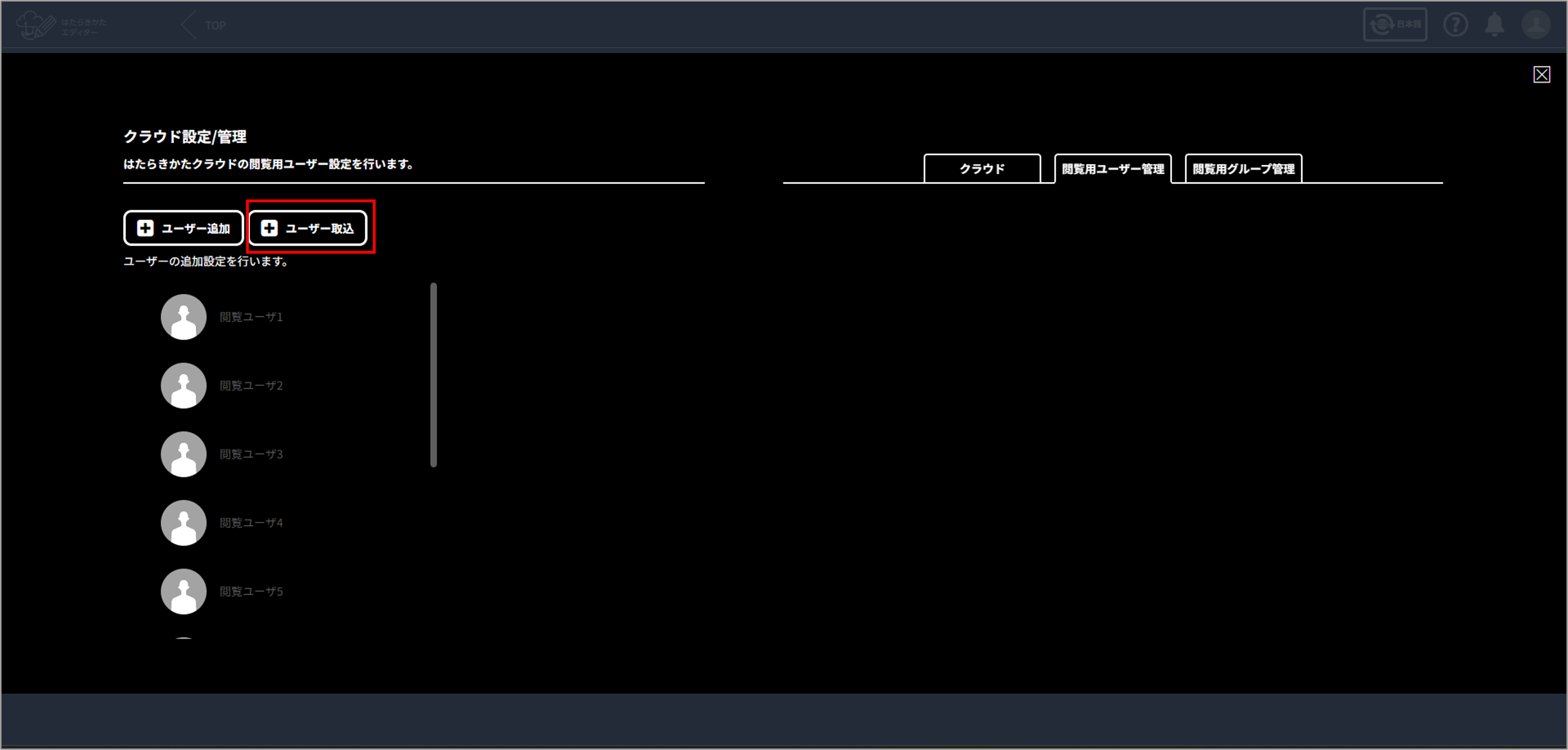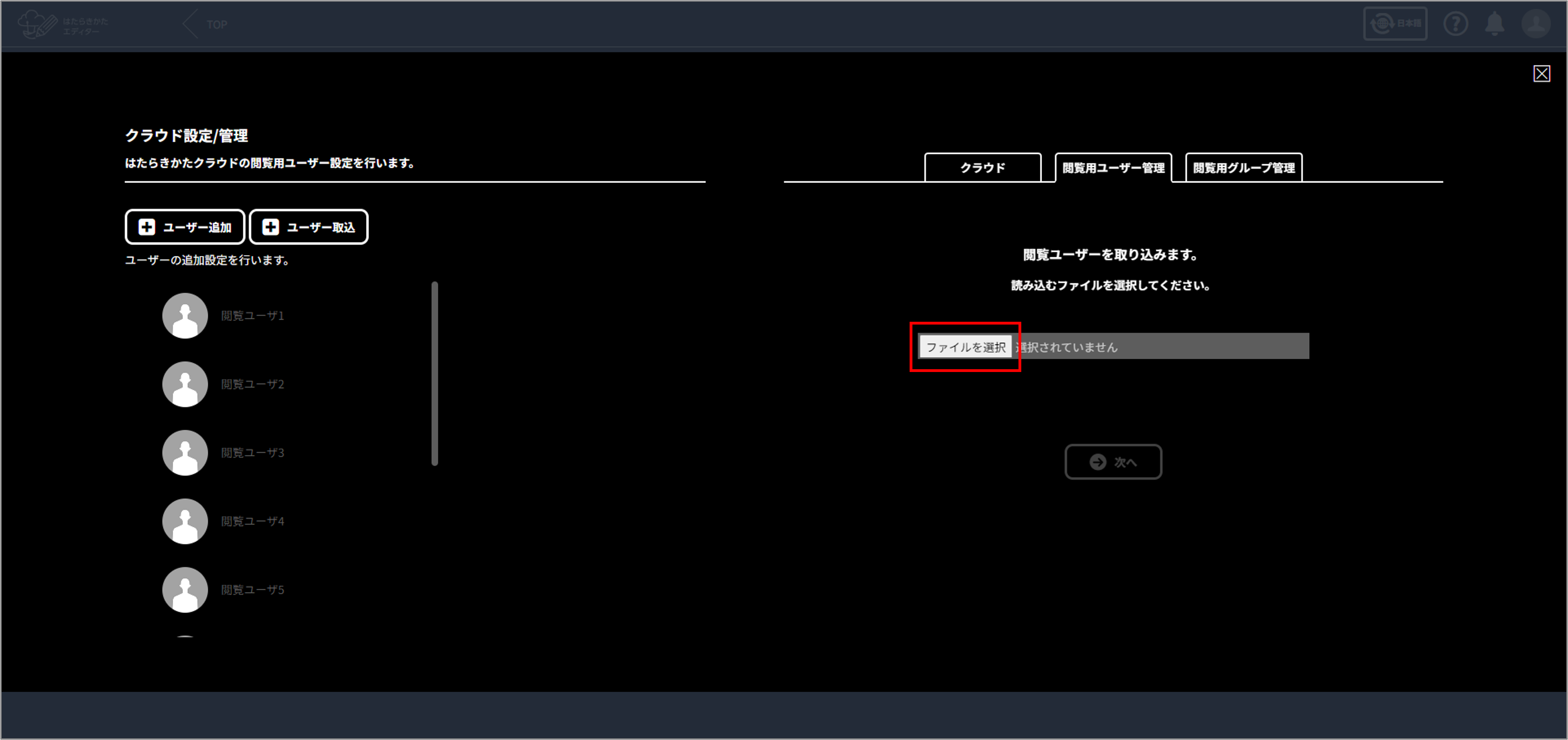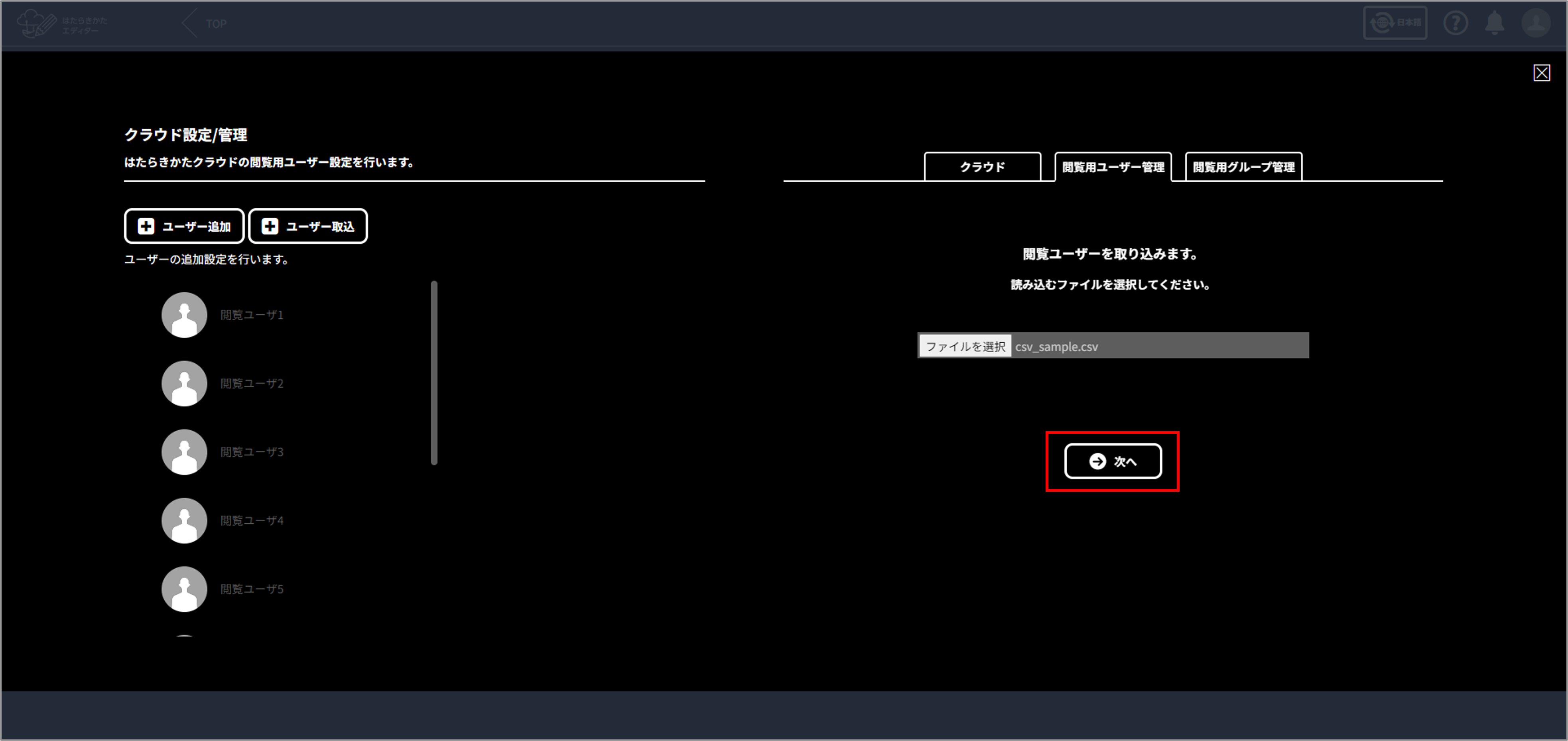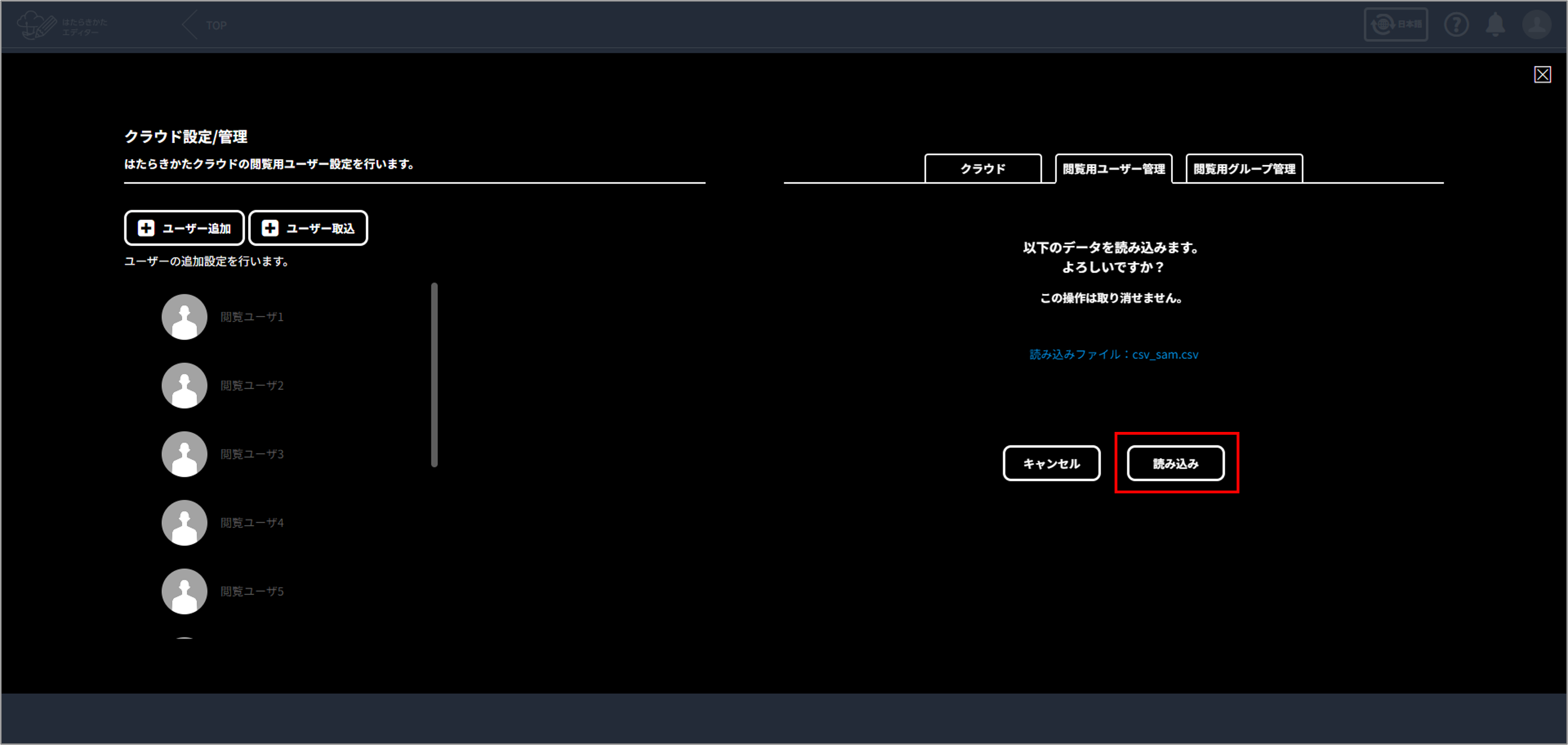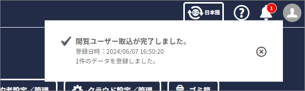 「閲覧ユーザー取込が完了しました。」 と表示されたら完了です。