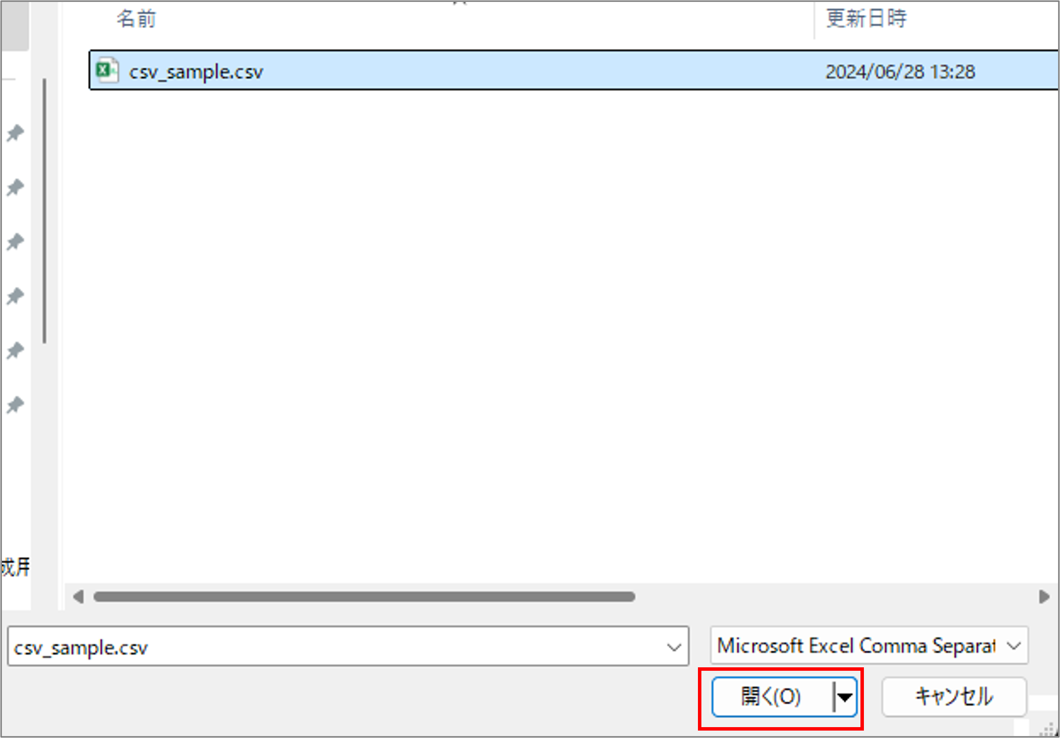 [ファイルを選択]をクリックして手順1で作成したCSVファイルを選択し、[開く]をクリックしする
