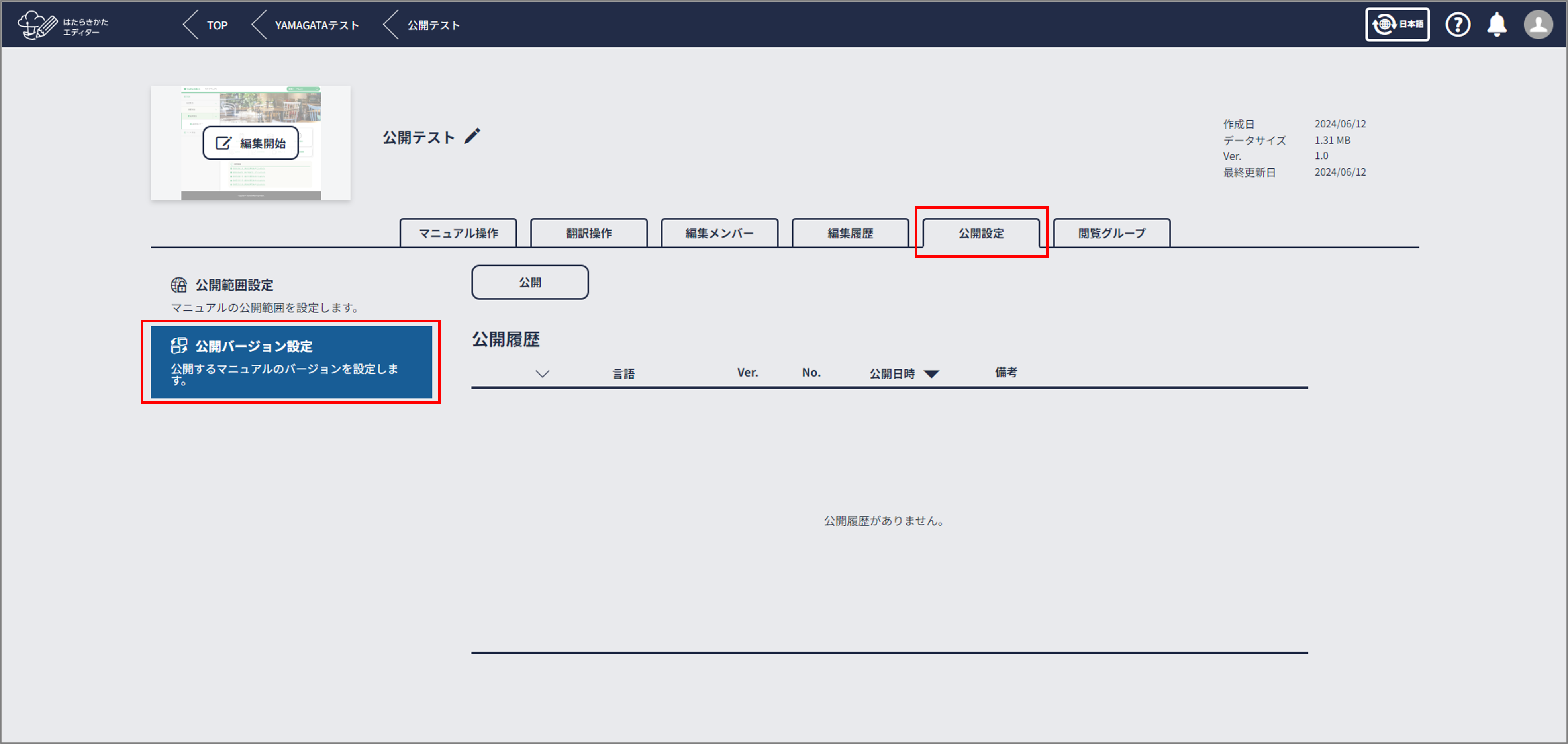 [公開設定]をクリックし、[公開バージョン設定]をクリックする
