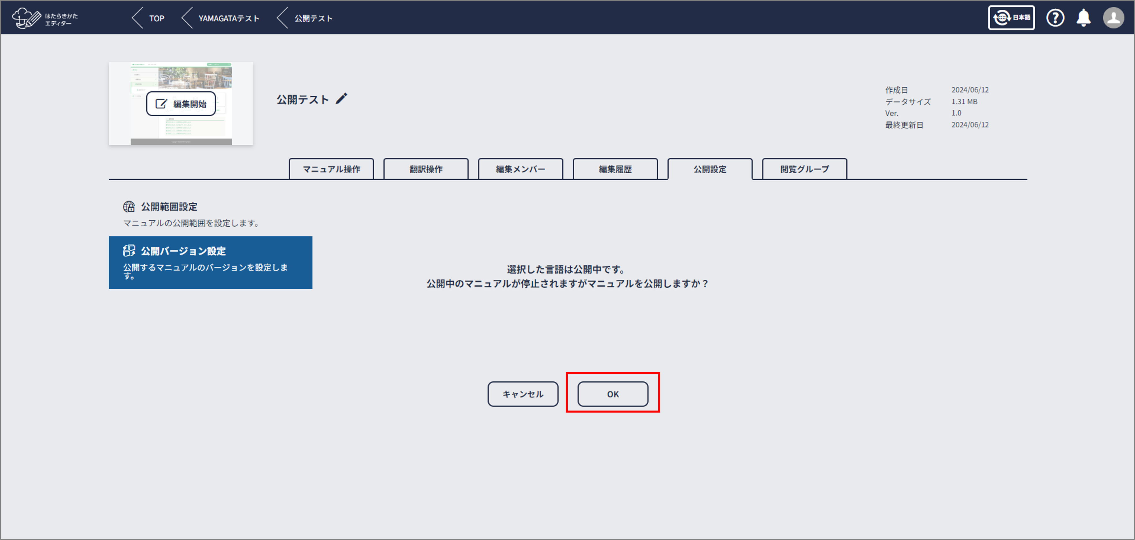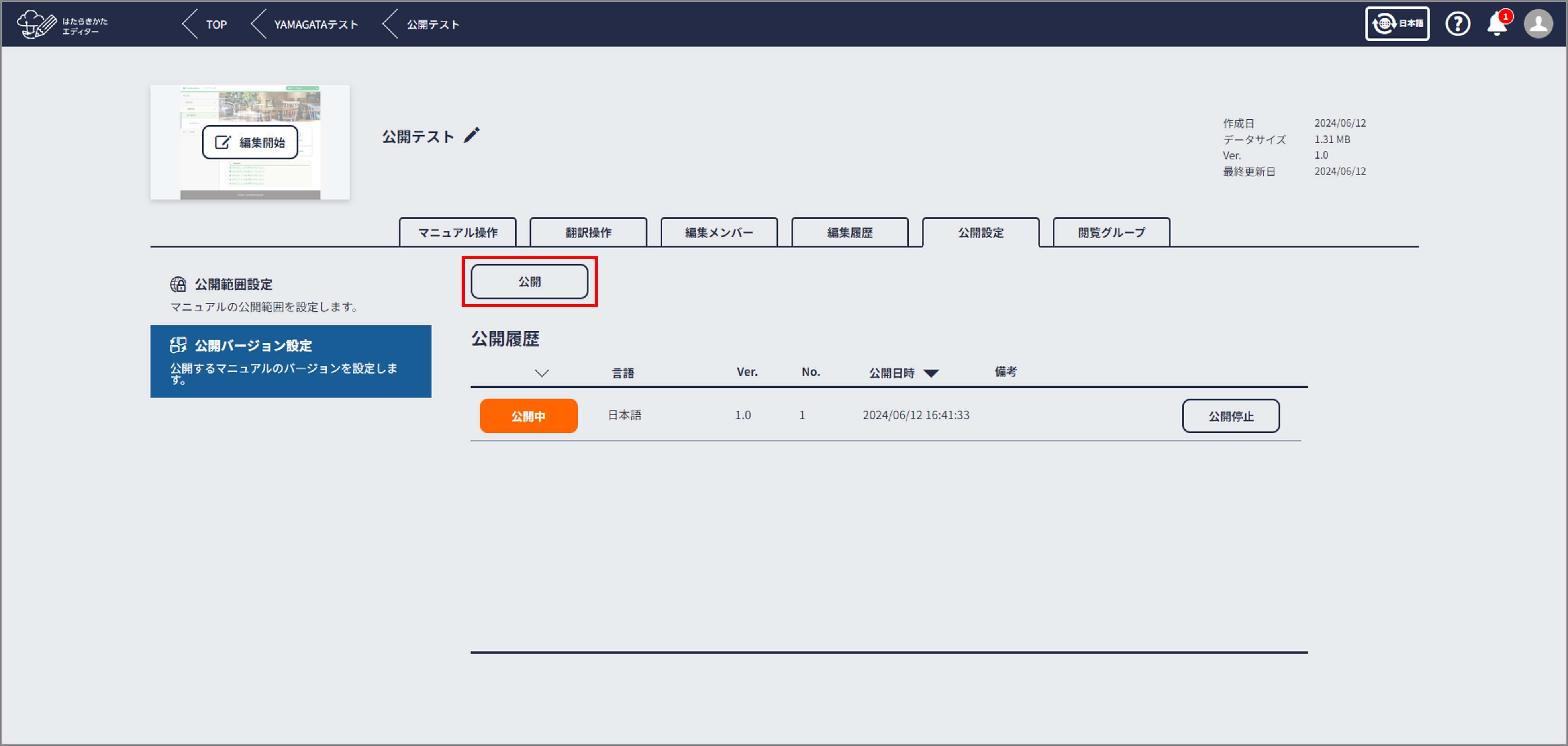 更新するマニュアルの[公開設定]をクリックし、[公開バージョン設定]をクリックする