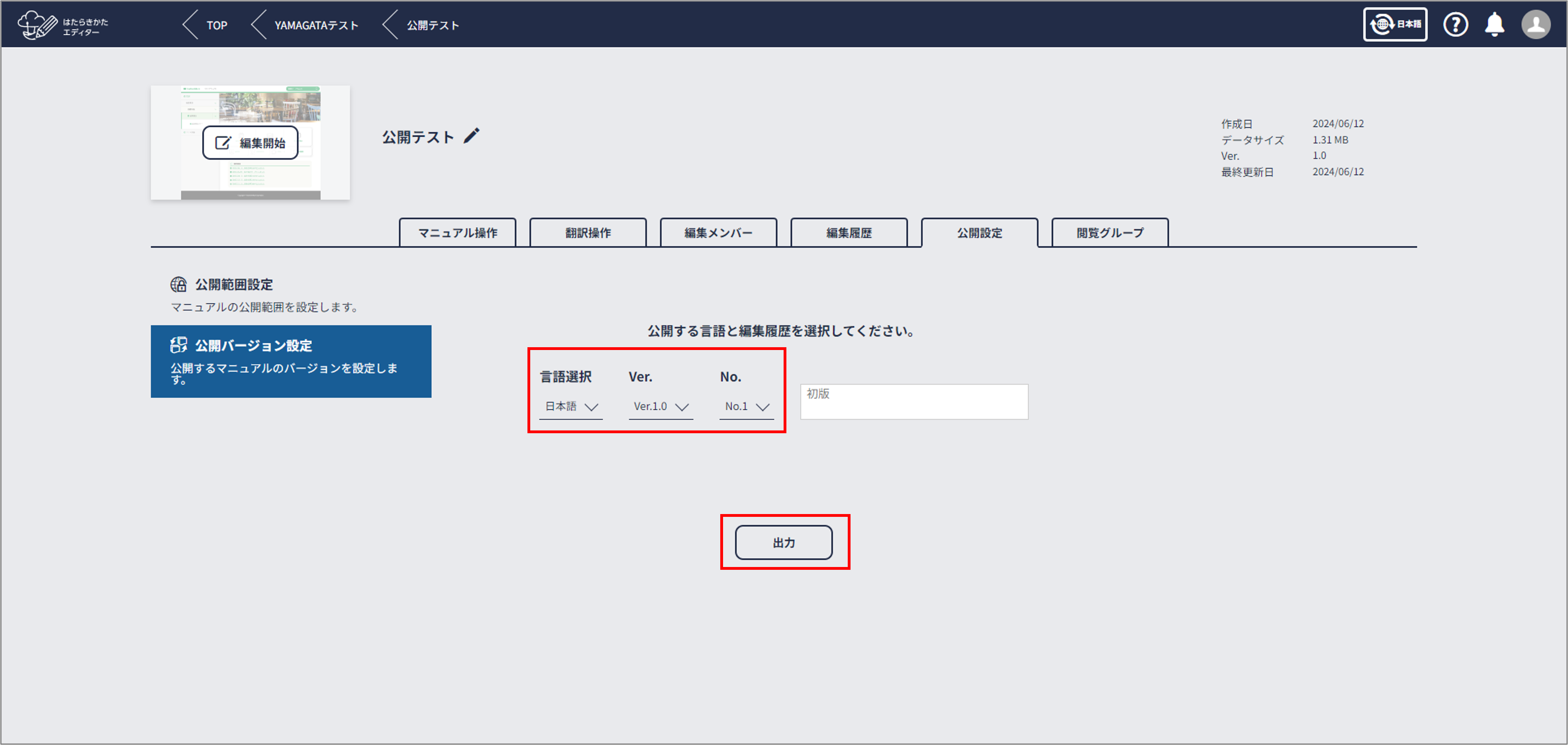 公開する言語 ・バージョン・No.を選択し、[出力]をクリックする