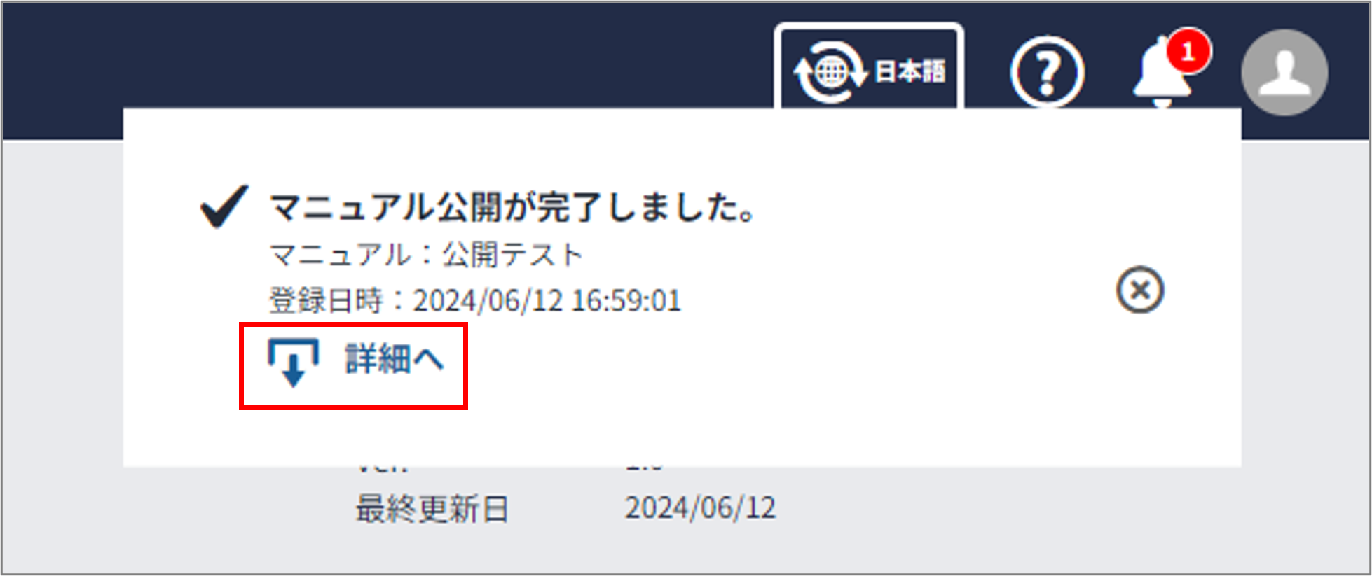 画面右上の通知アイコンをクリックして公開処理の状態を確認し、[詳細へ]をクリックする