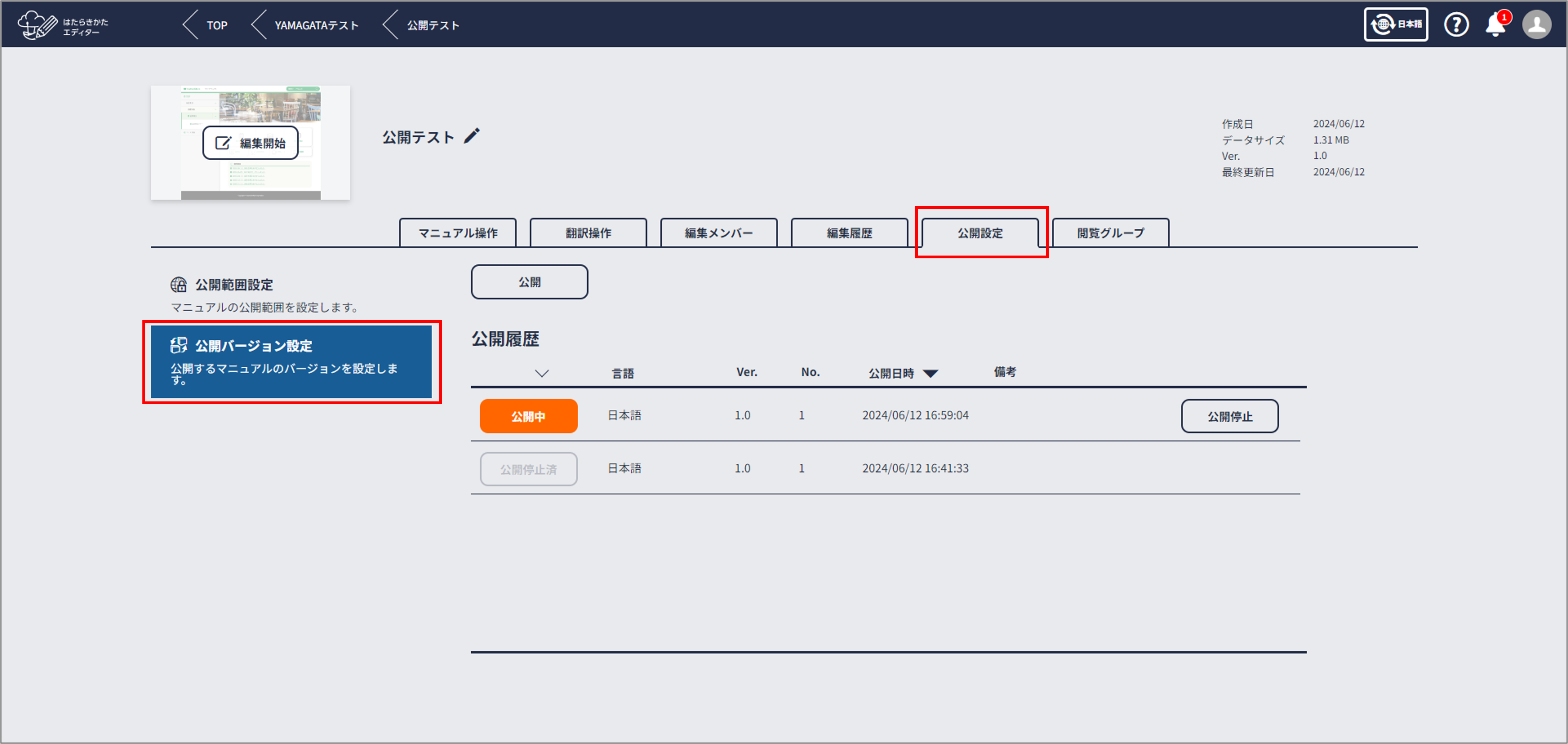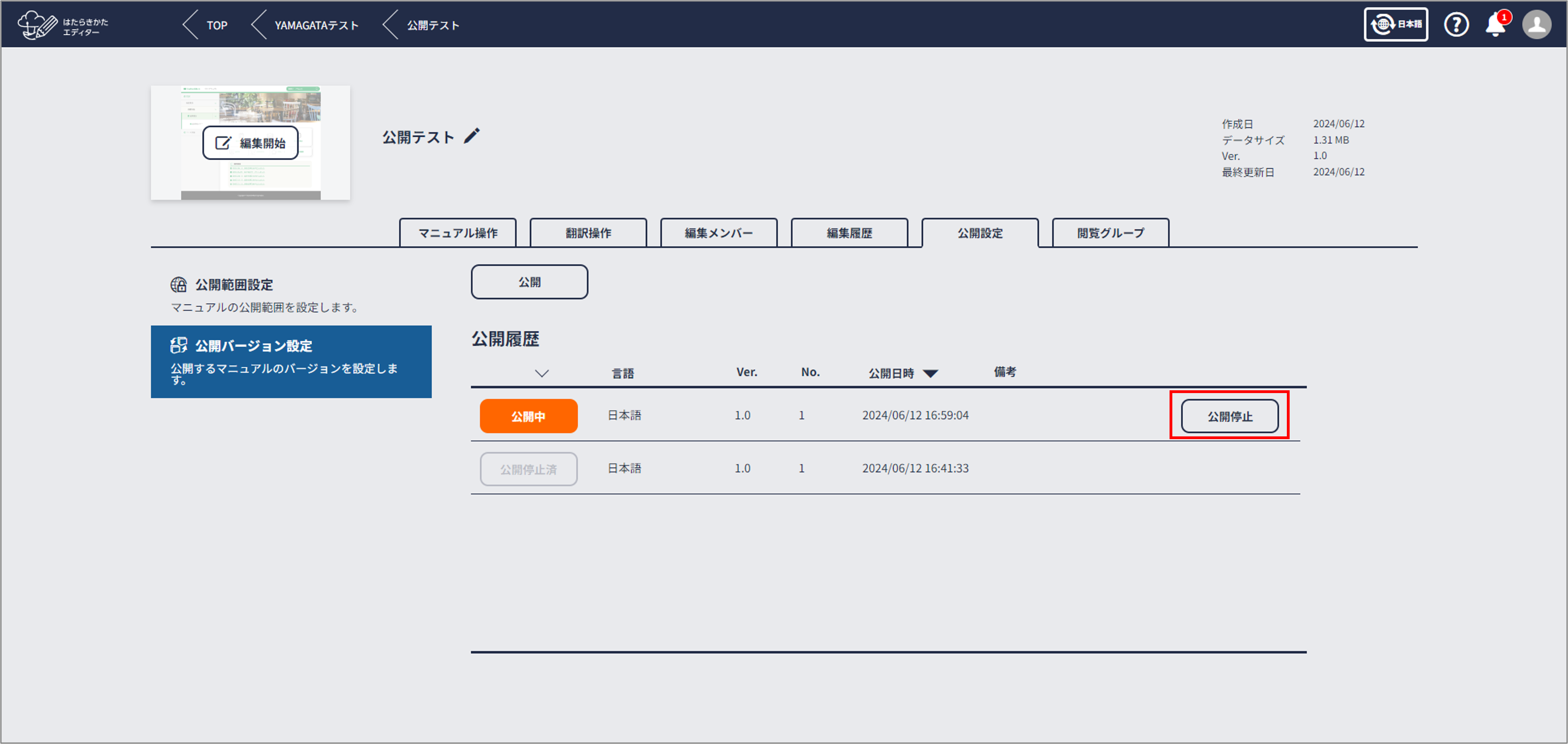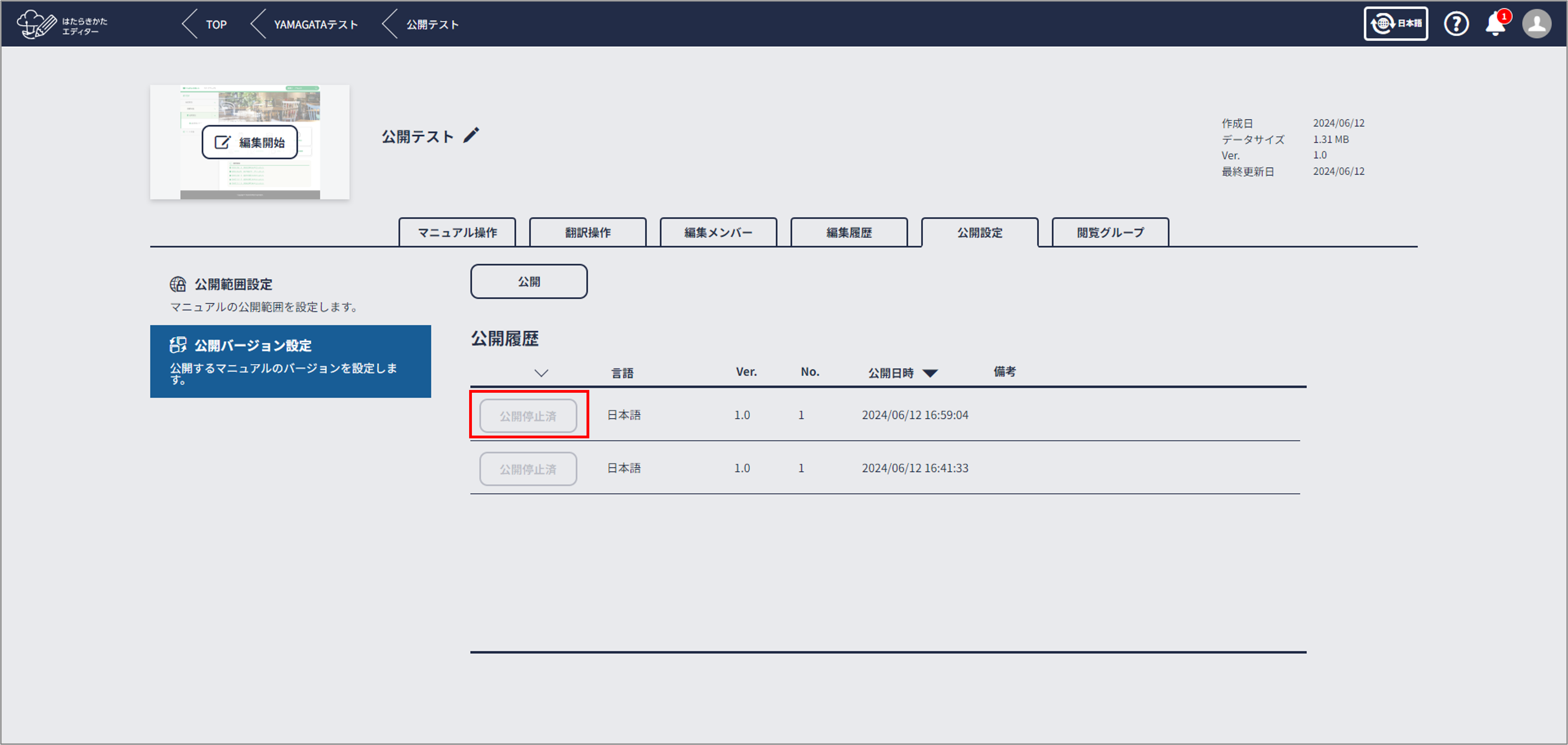 対象のマニュアルが「公開停止済」になっていることを確認する