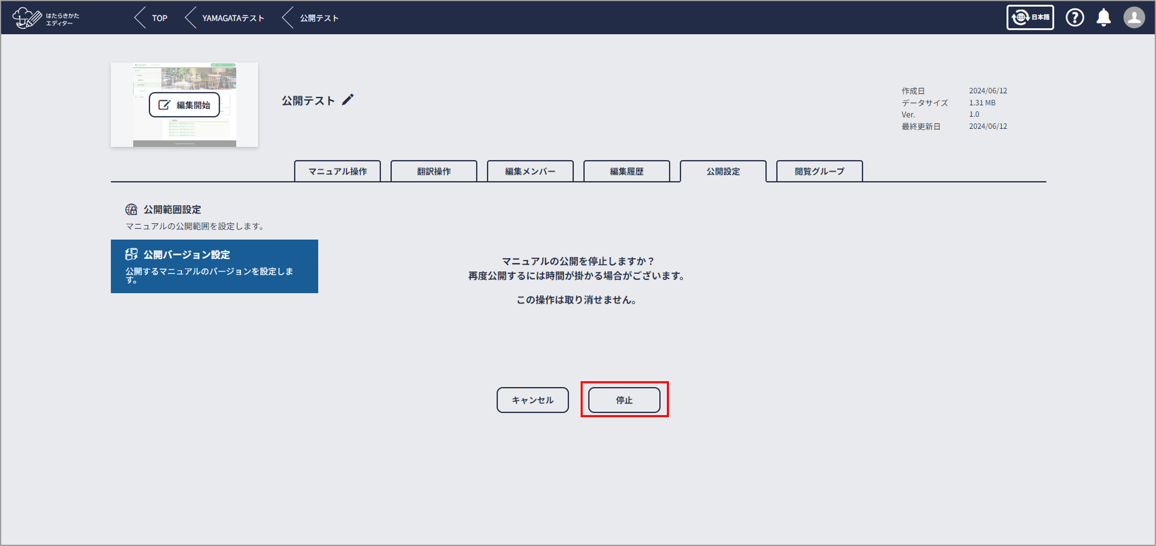 公開中のマニュアルが不要になった場合は、公開を停止できます。公開を停止したあとでもマニュアルデータがあれば、再公開が可能です。