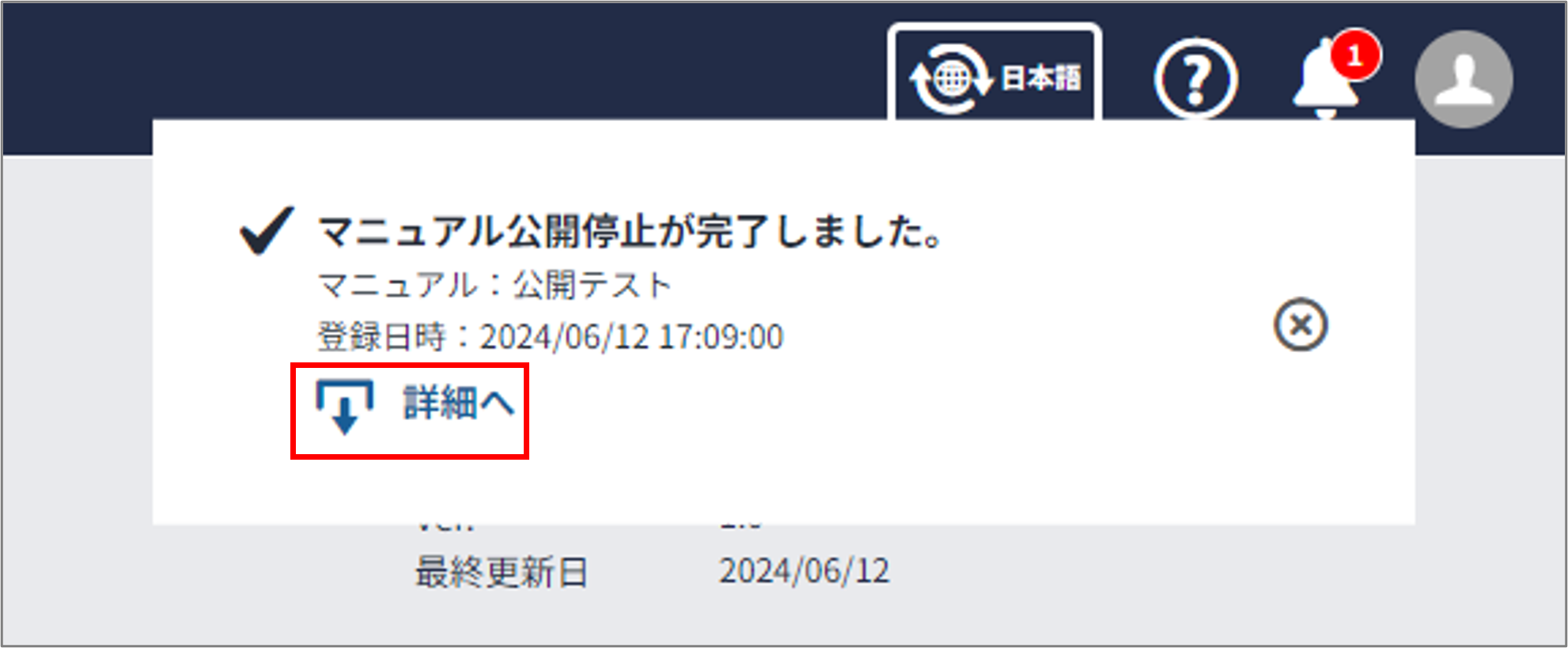 画面右上の通知アイコンをクリックして公開処理の状態を確認し、[詳細へ]をクリックする