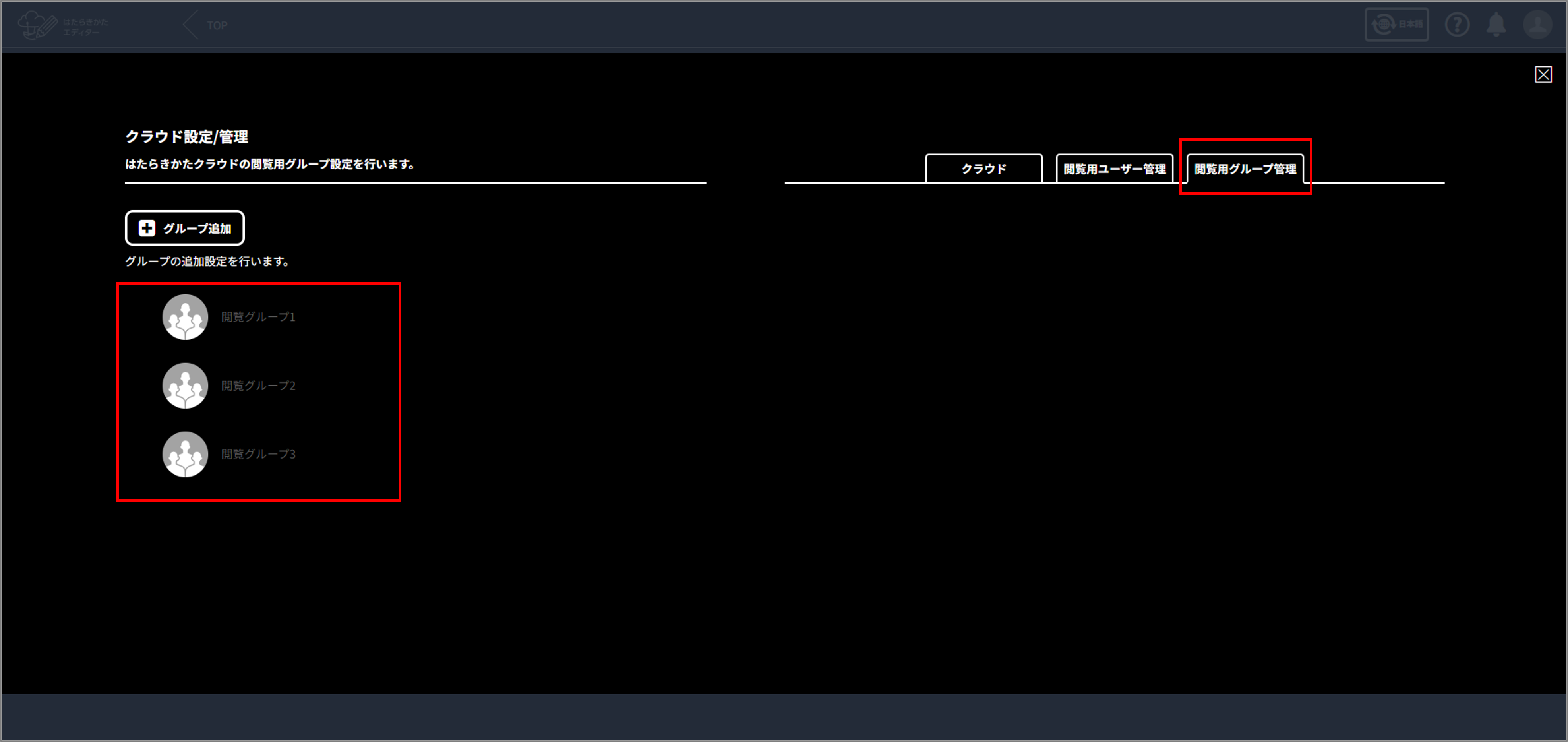 「閲覧用グループ管理」の画面表示方法は、「閲覧グループを作成する」を参照してください。