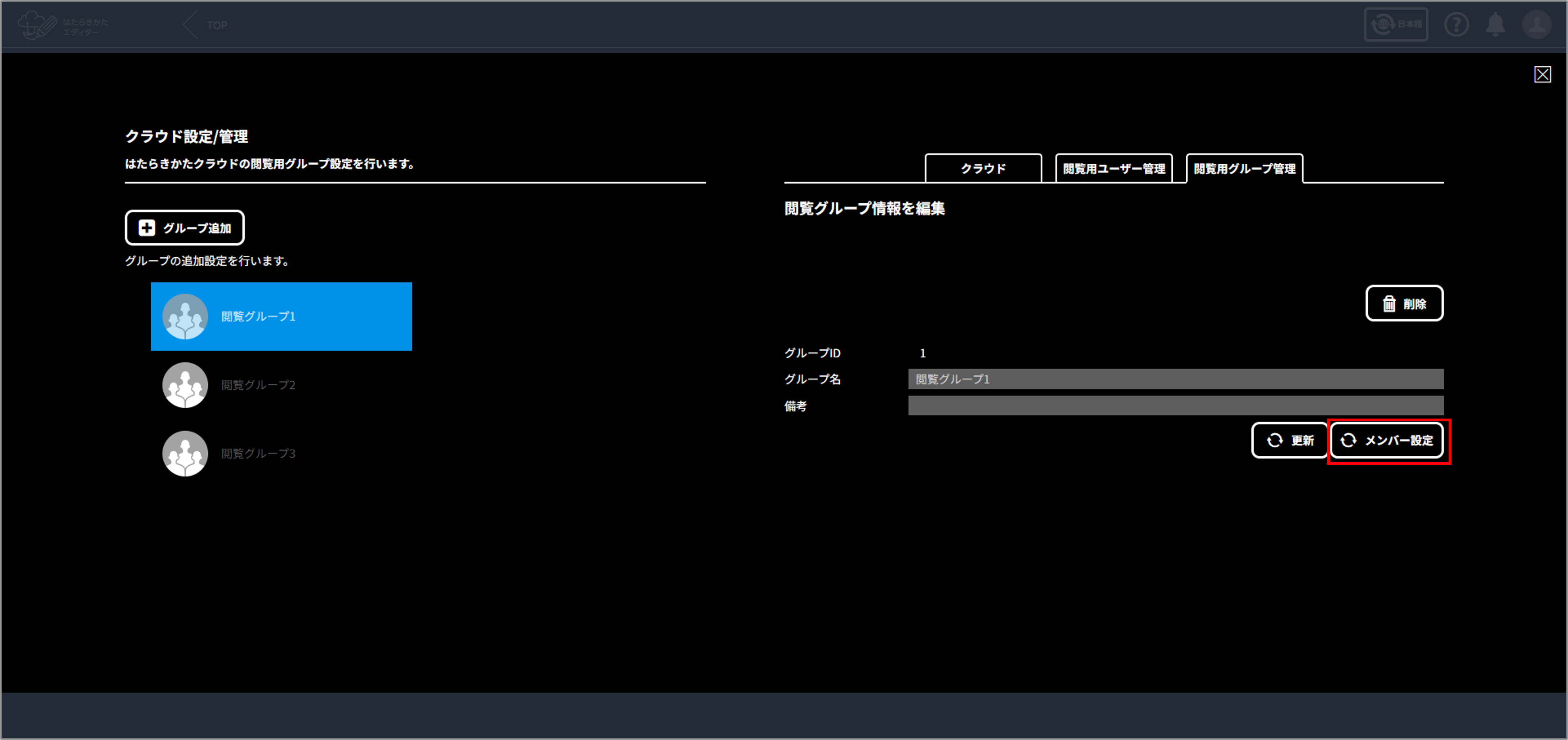 閲覧グループにメンバーを登録するには、はたらきかたエディターの「管理」権限が必要です。