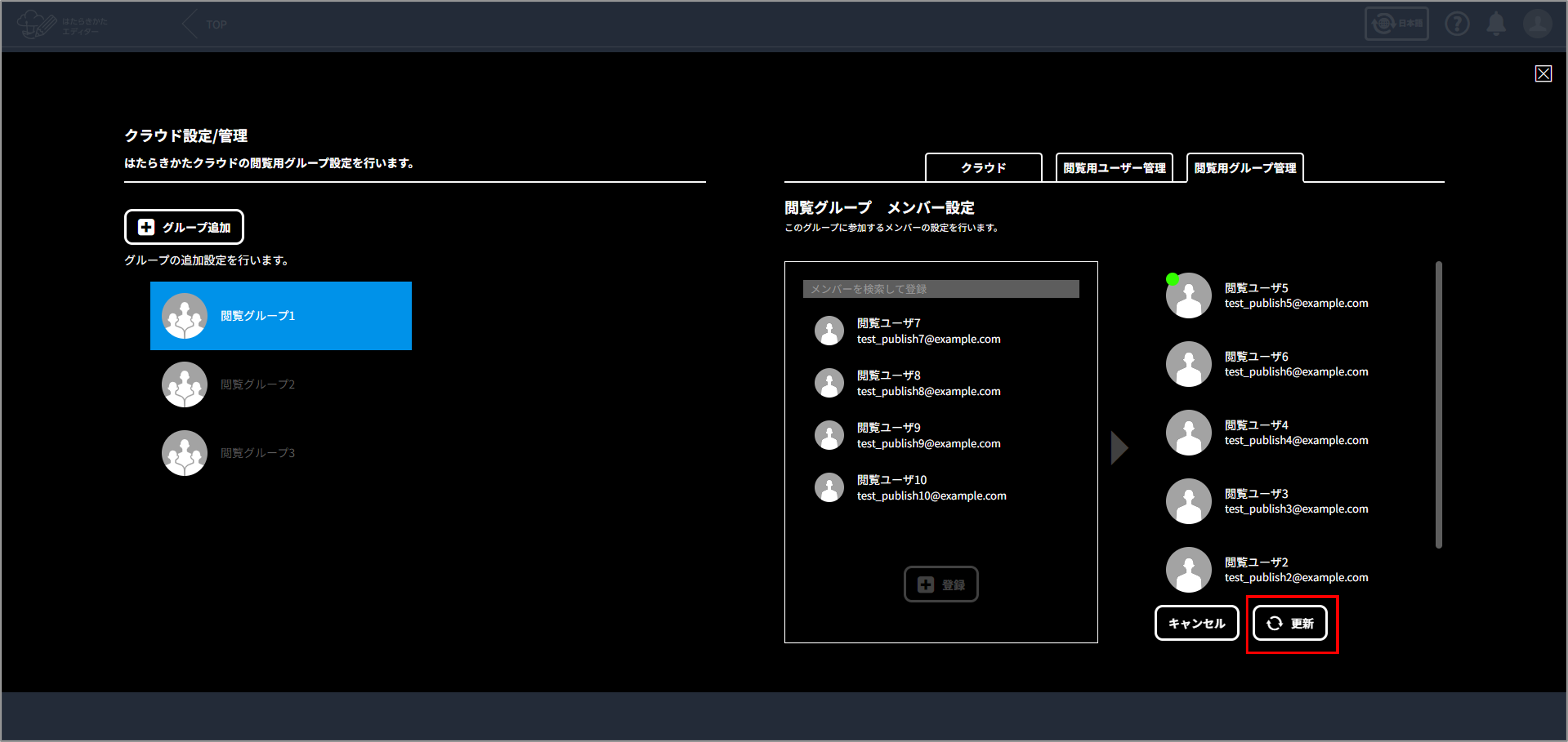 閲覧ユーザーを、作成した閲覧グループのメンバーとして登録します。あらかじめ閲覧ユーザーを登録しておいてください。