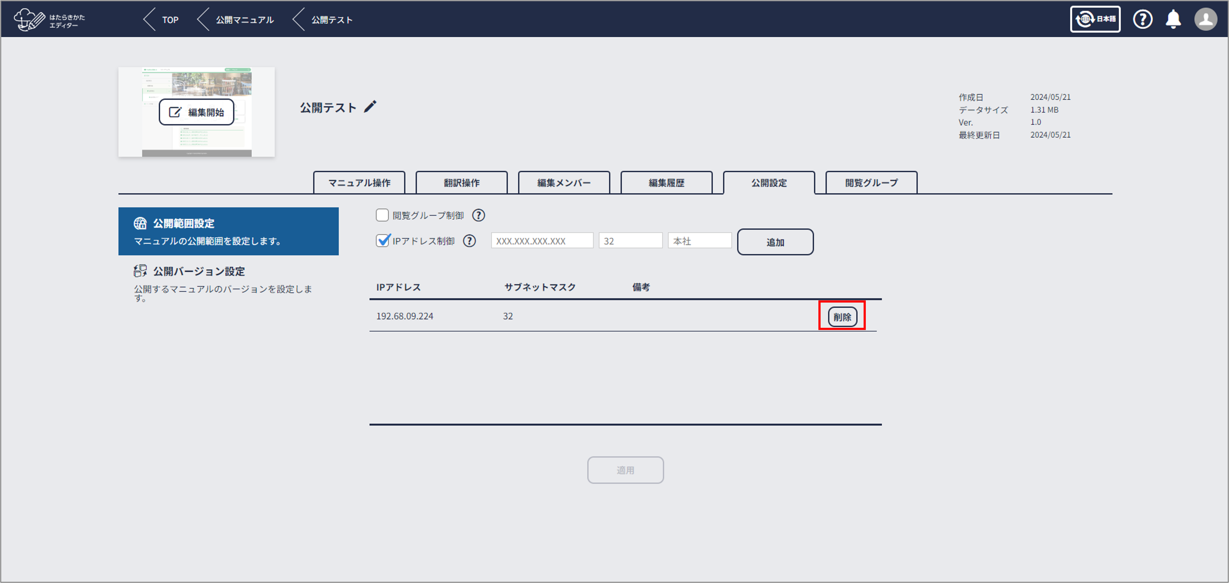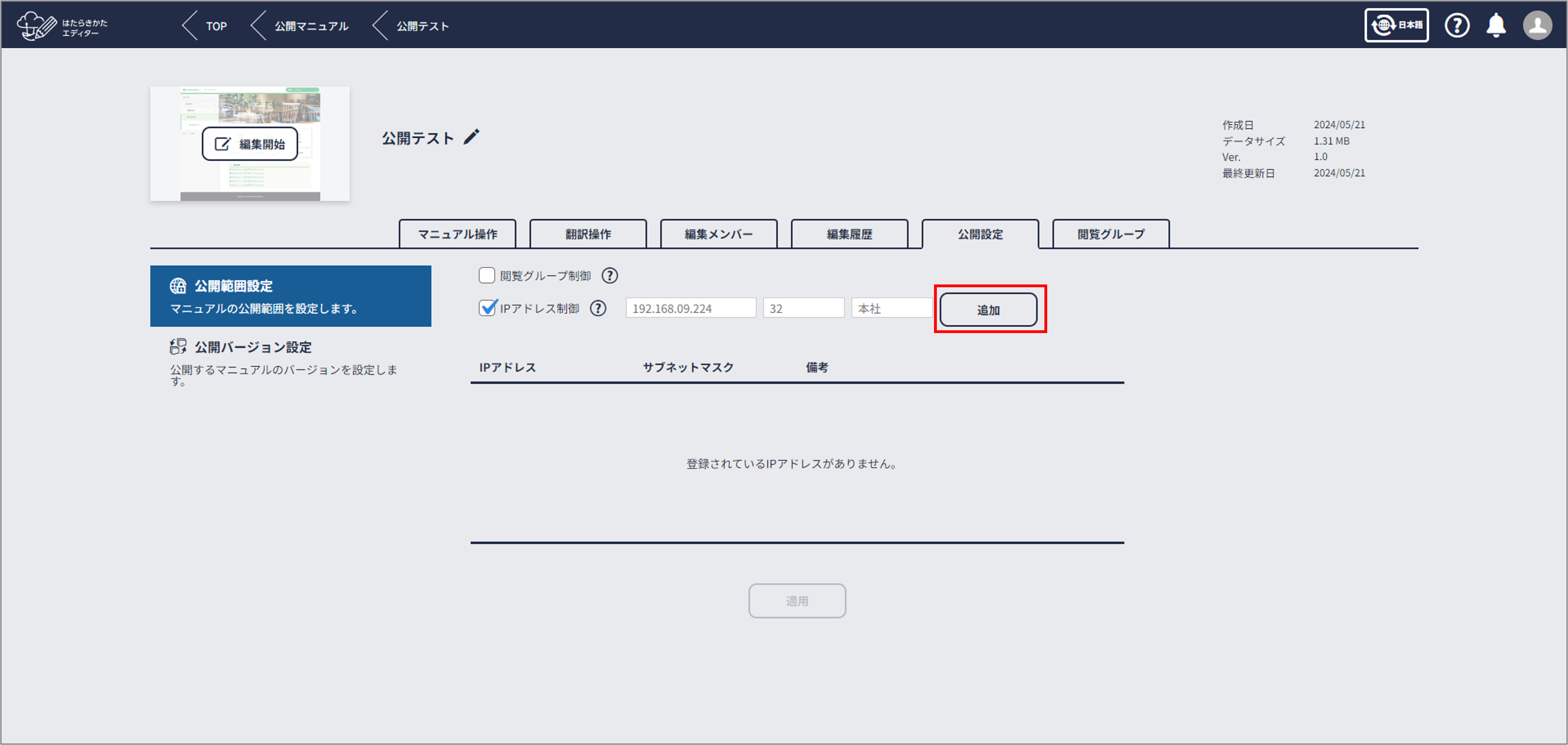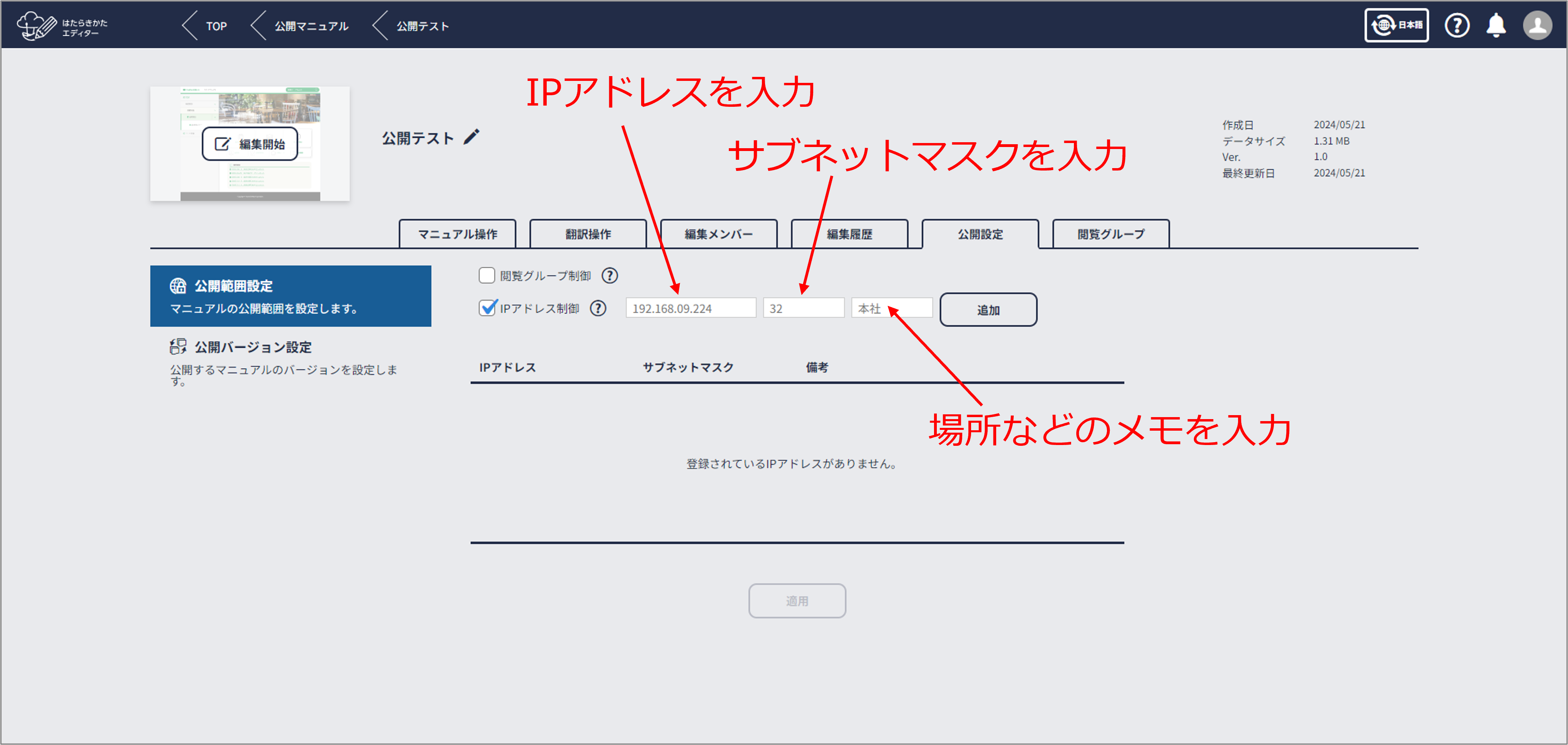 設定したIPアドレスからの接続であれば、はたらきかたクラウドにログインすることなくURLを知っているすべての人がマニュアルを閲覧できるようになります。