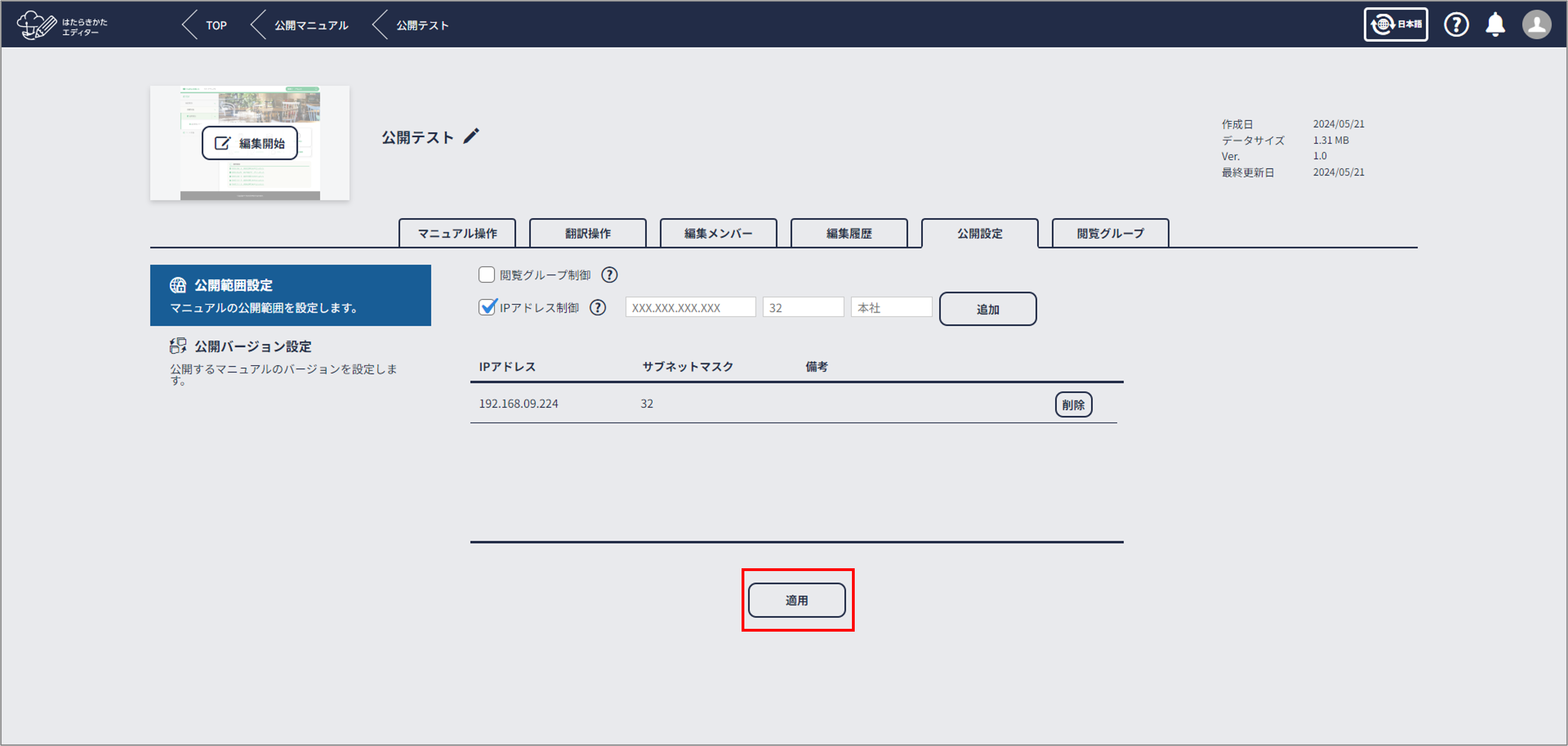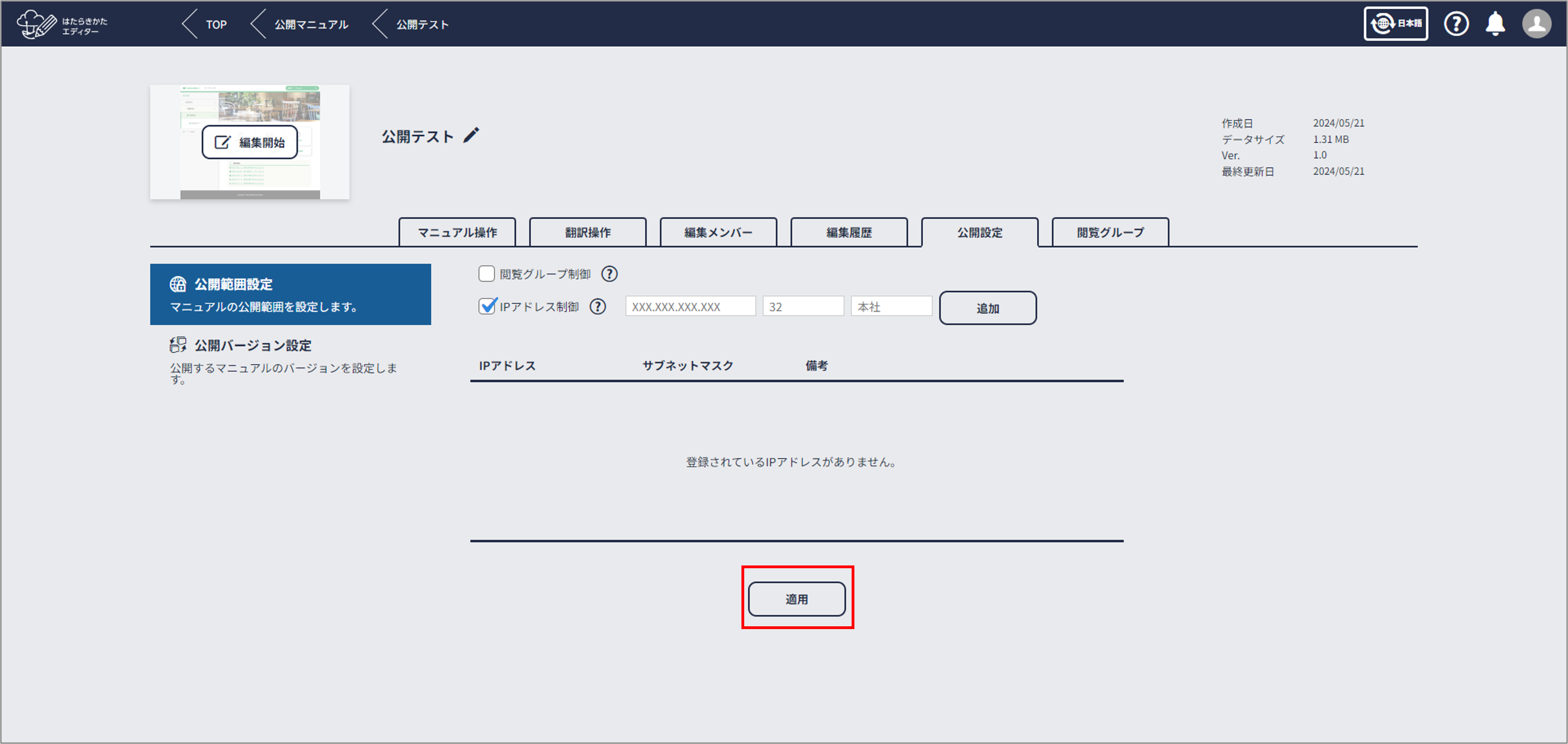 必要なIPアドレスの登録が完了したら[適用]をクリックする