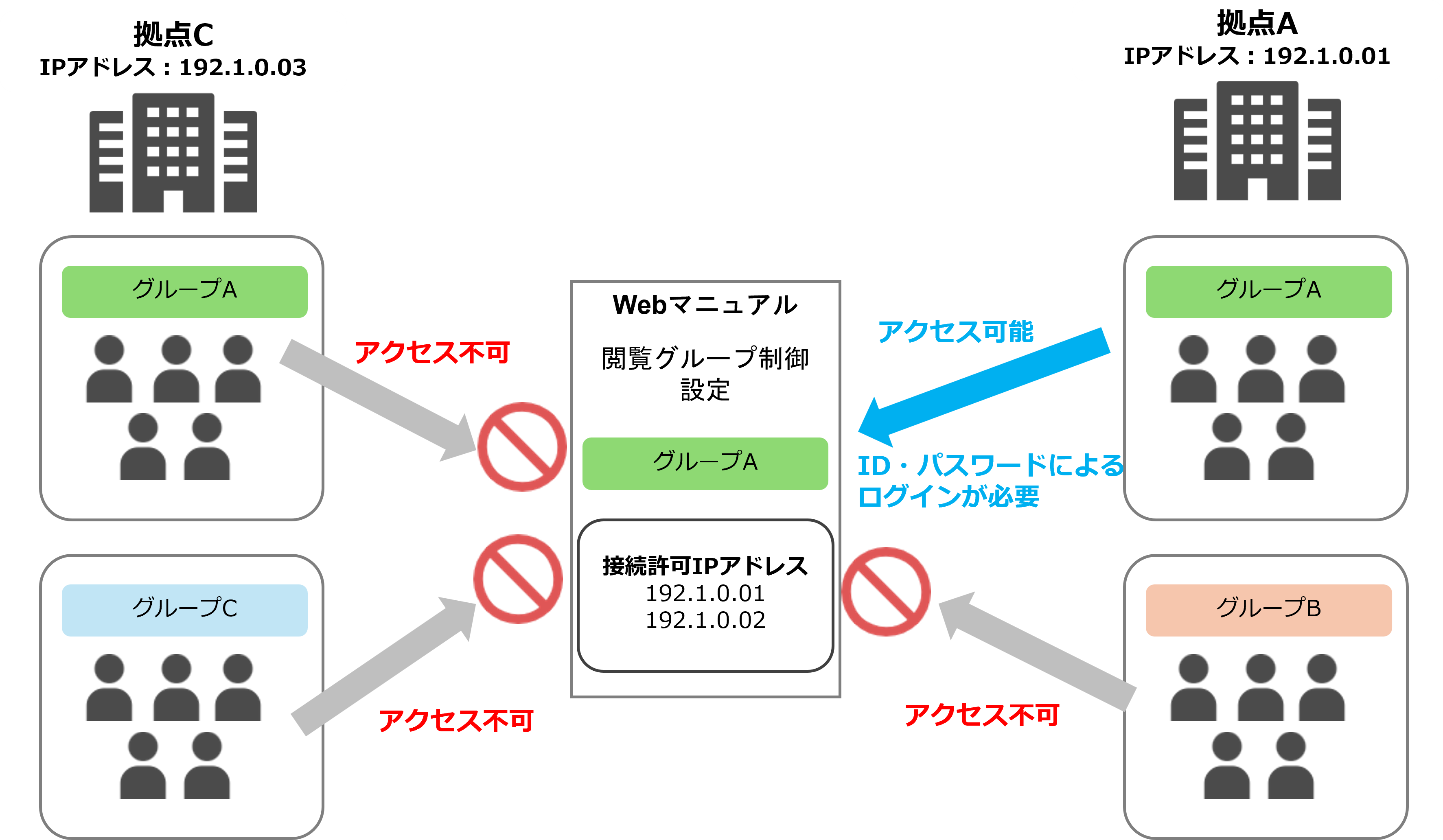 登録した閲覧グループのメンバーが、設定したIPアドレスからアクセスしたときのみマニュアルを閲覧できるように公開範囲を設定します。