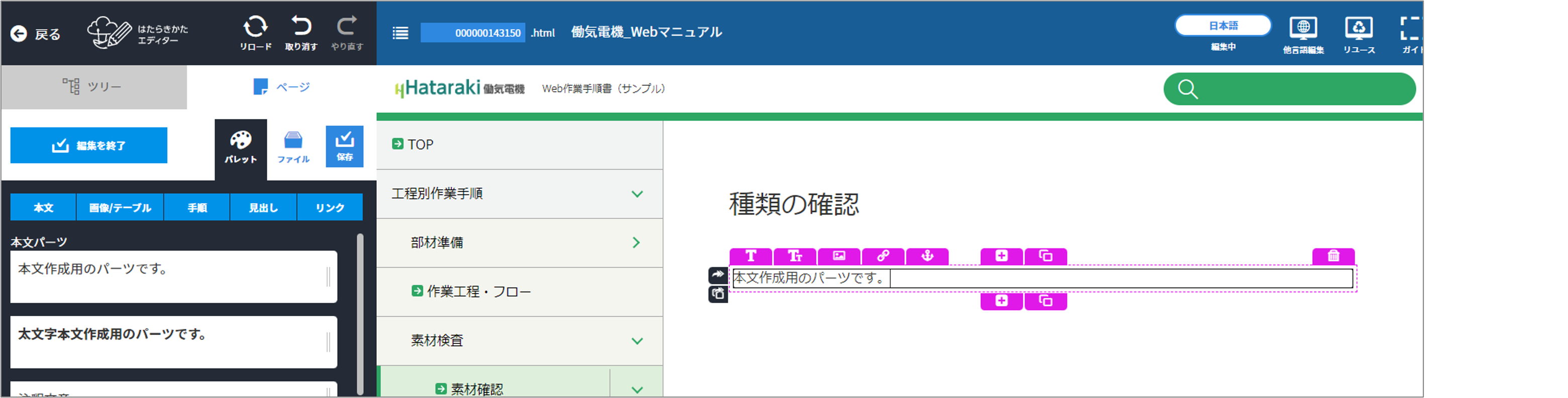 はたらきかたエディターで入力したテキストには、太字や下線などの文字装飾や他ページへのリンクを付けることができます。一部のパーツでは行内にアイコンなどの画像を挿入することもできます。