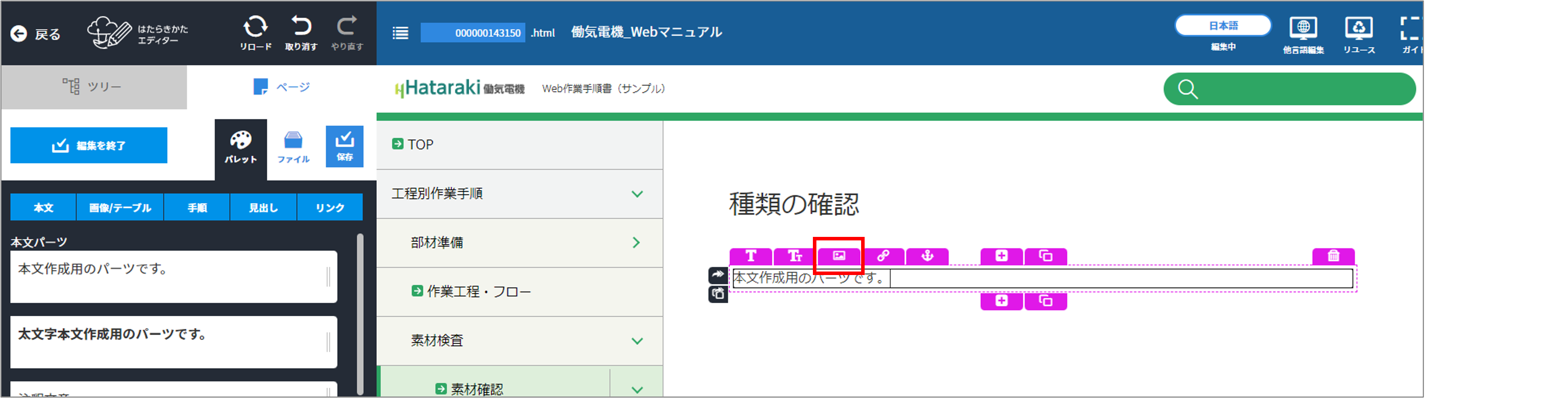 各種パーツで入力中に、画像を入れたい場所にカーソルを置き、[動画・画像]をクリックする