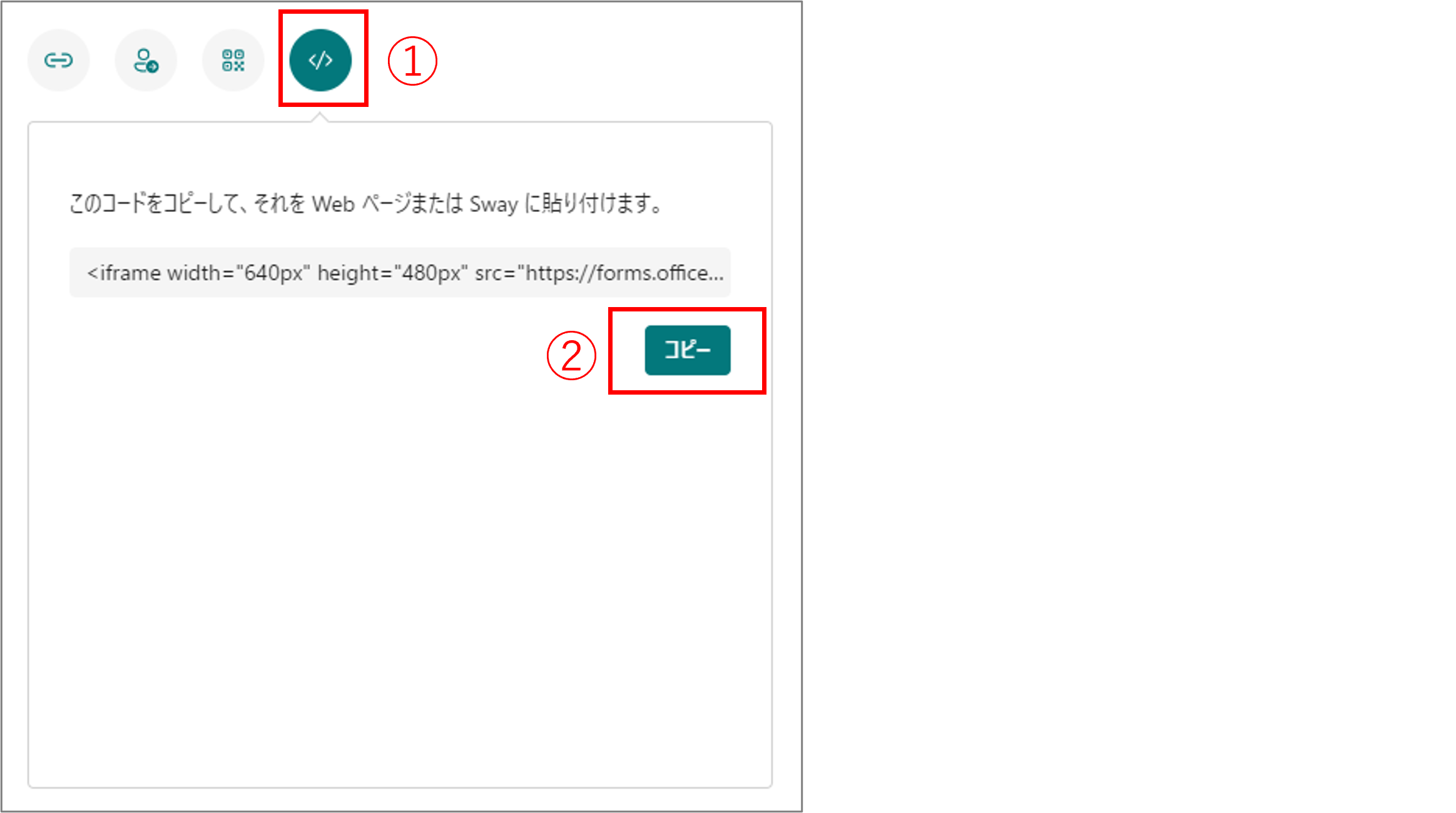 埋め込みのコードのマーク(<>)をクリックし、[コピー]をクリックする