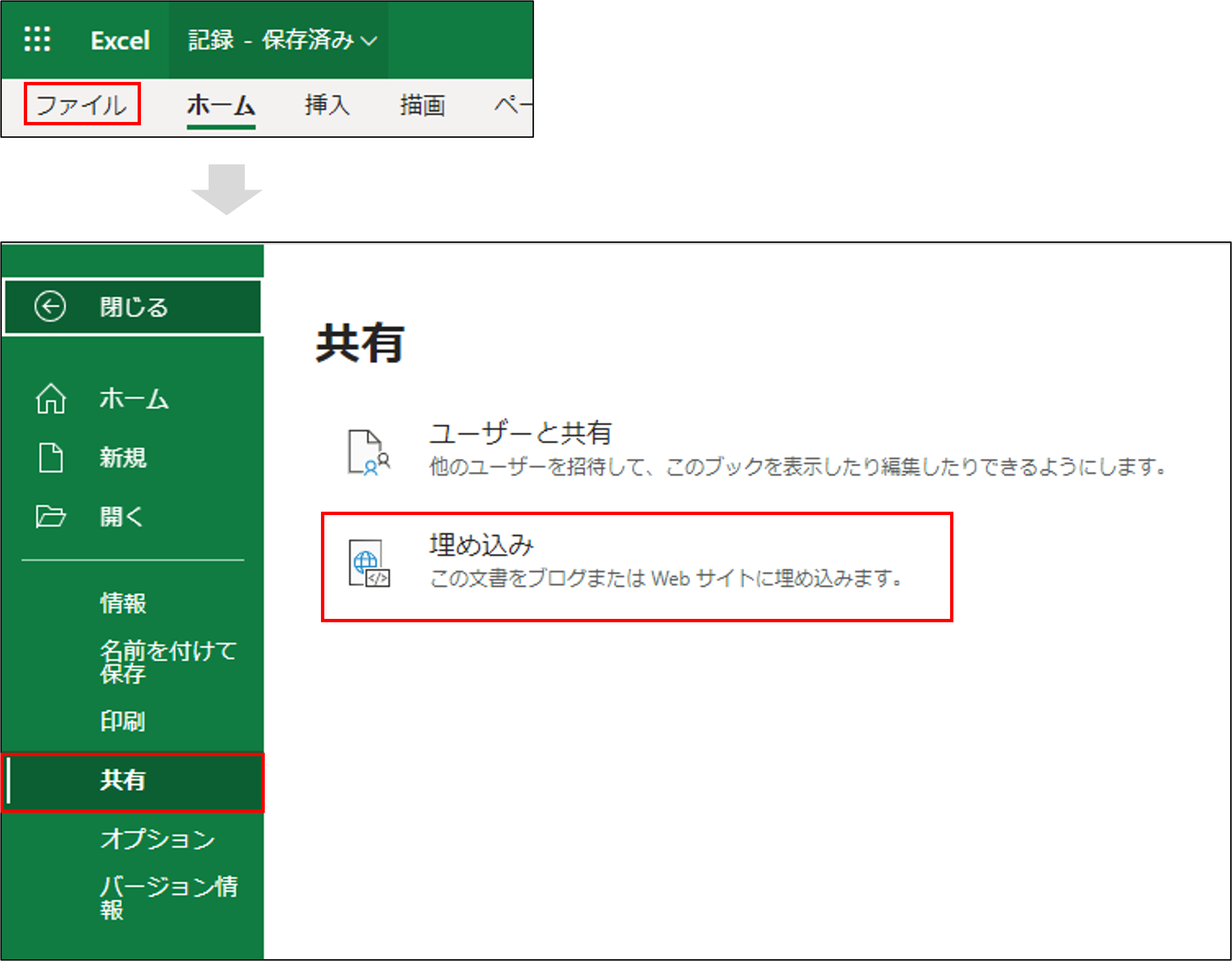 [ファイル]→[共有]→[埋め込み]の順に選択する