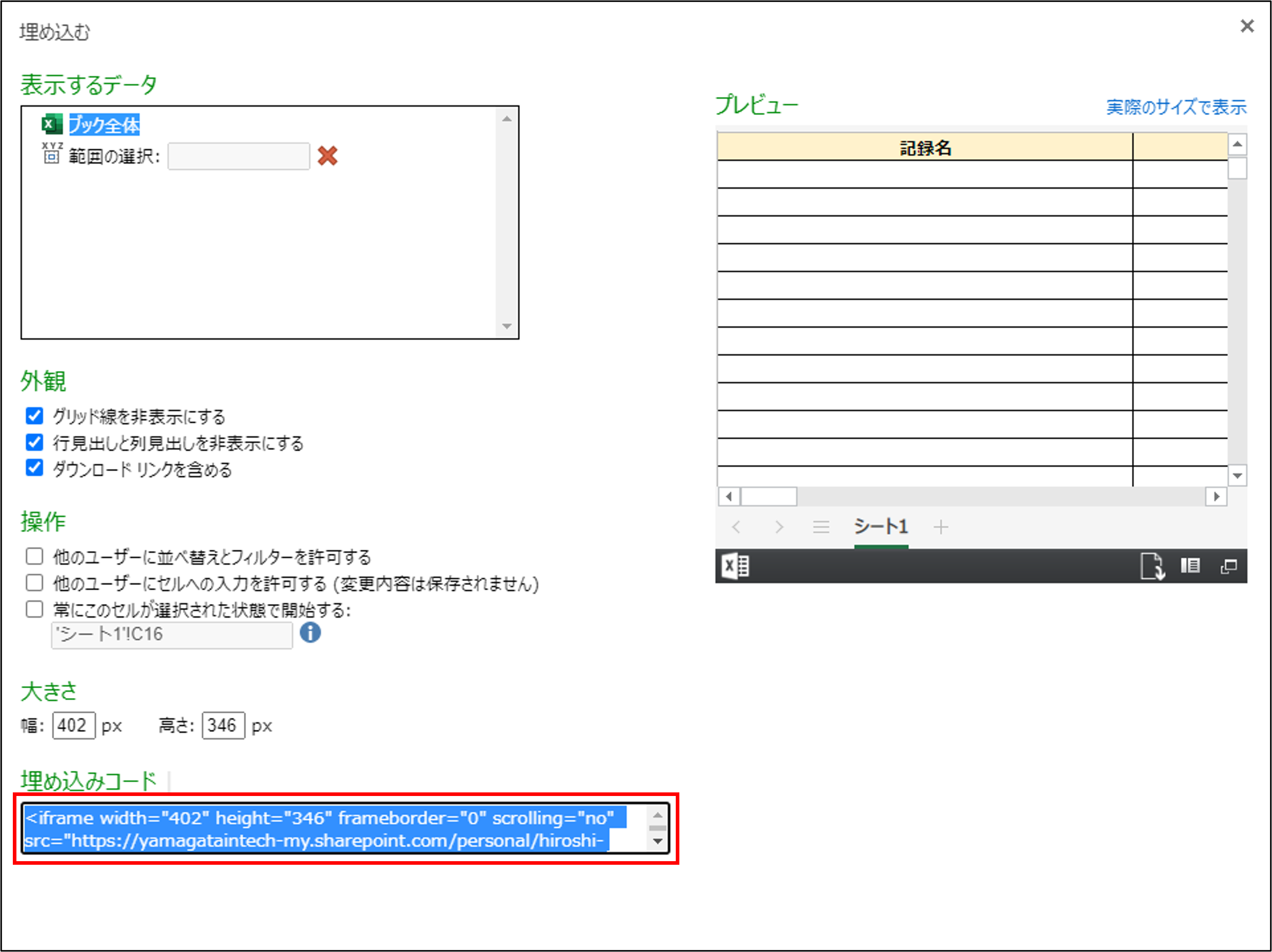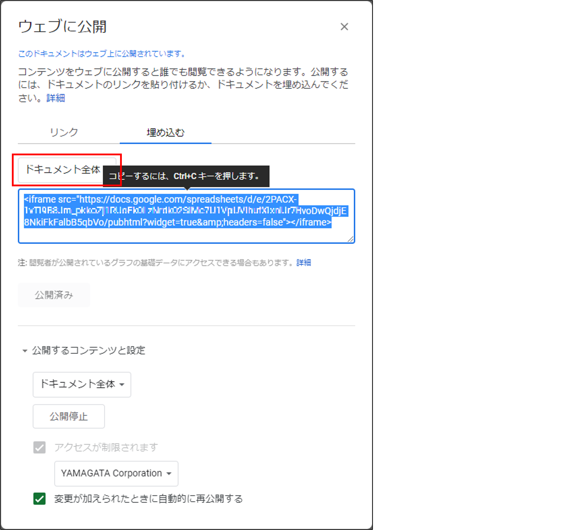 [ドキュメント全体]をクリックして公開するシートを選択し、埋め込み用コードをコピーする