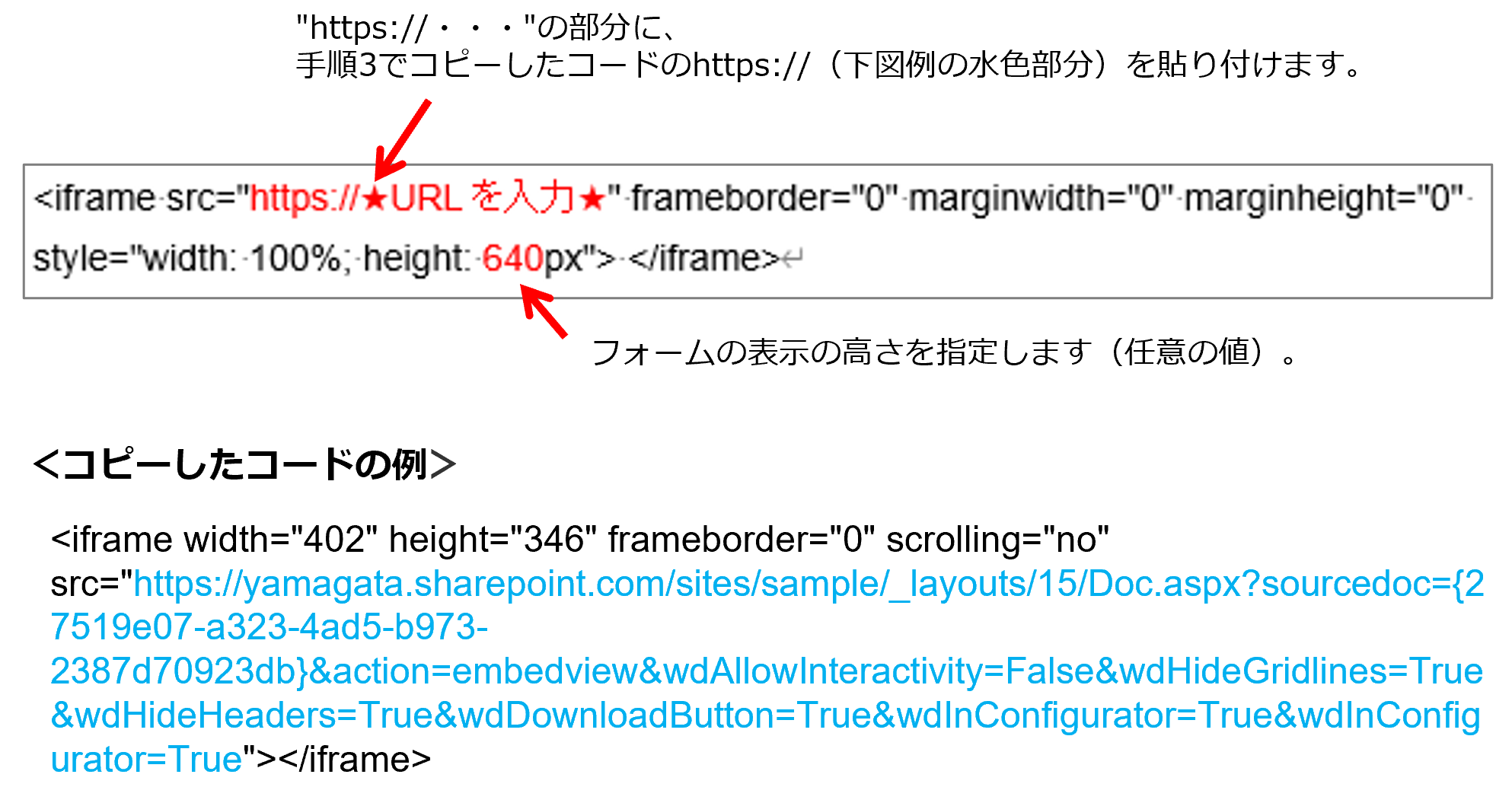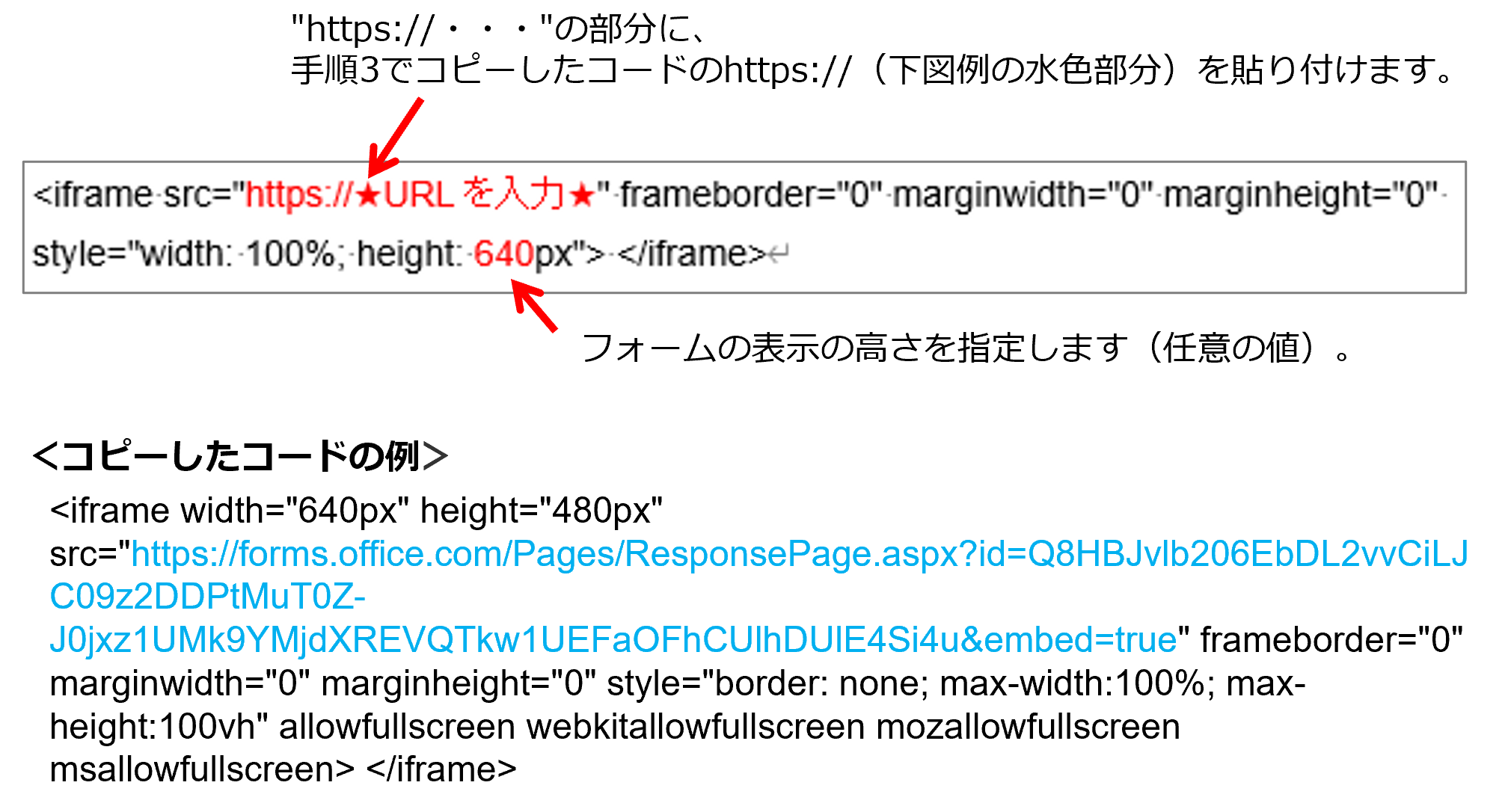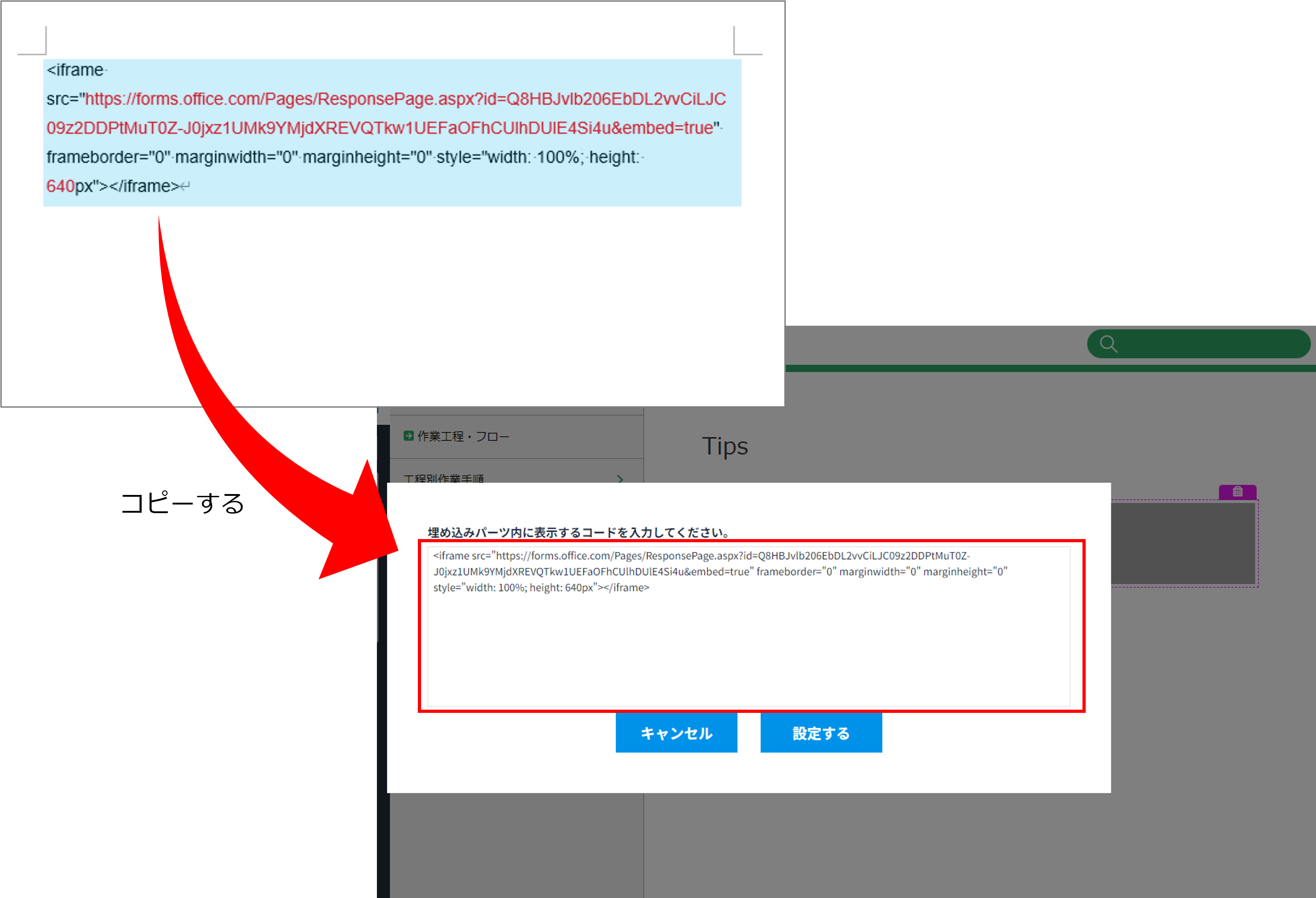 取得した埋め込み用コードをはたらきかたエディターに埋め込む手順は、「埋め込み用コードをページに貼り付ける」を参照してください。