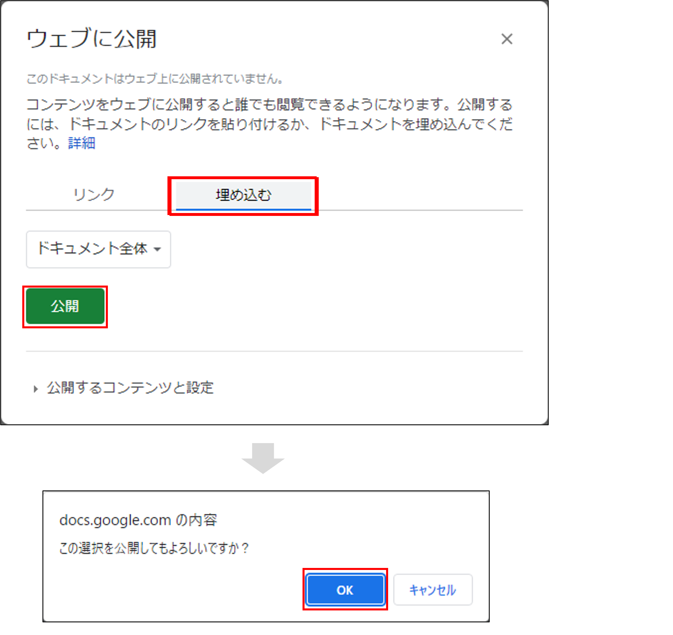 [埋め込む]→[公開]→[OK]の順に選択する