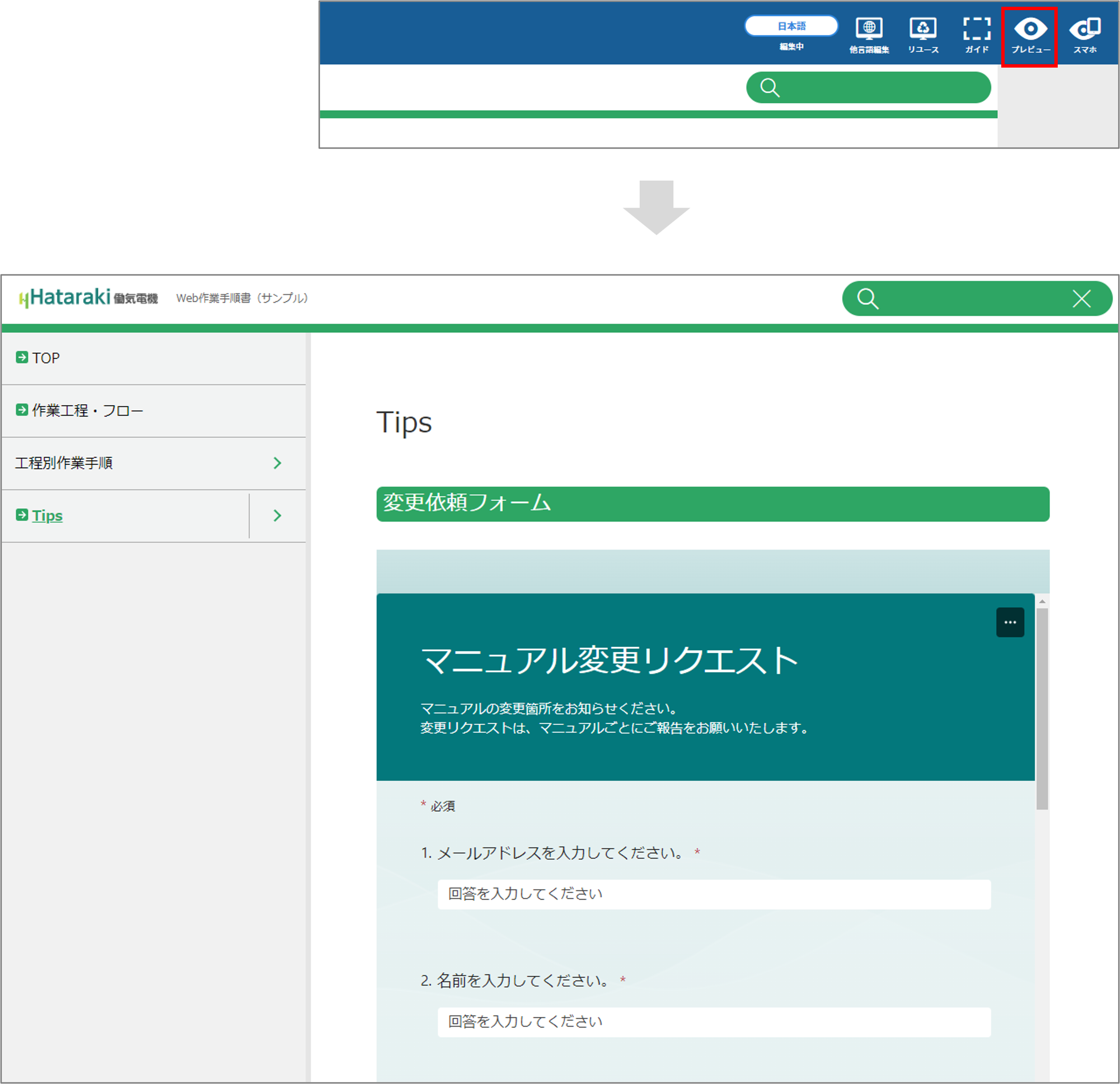 マニュアルの理解度を確認するためのアンケートフォームを配置したり、集計表などのエクセルファイルをマニュアルに埋め込んだりすることができます。
