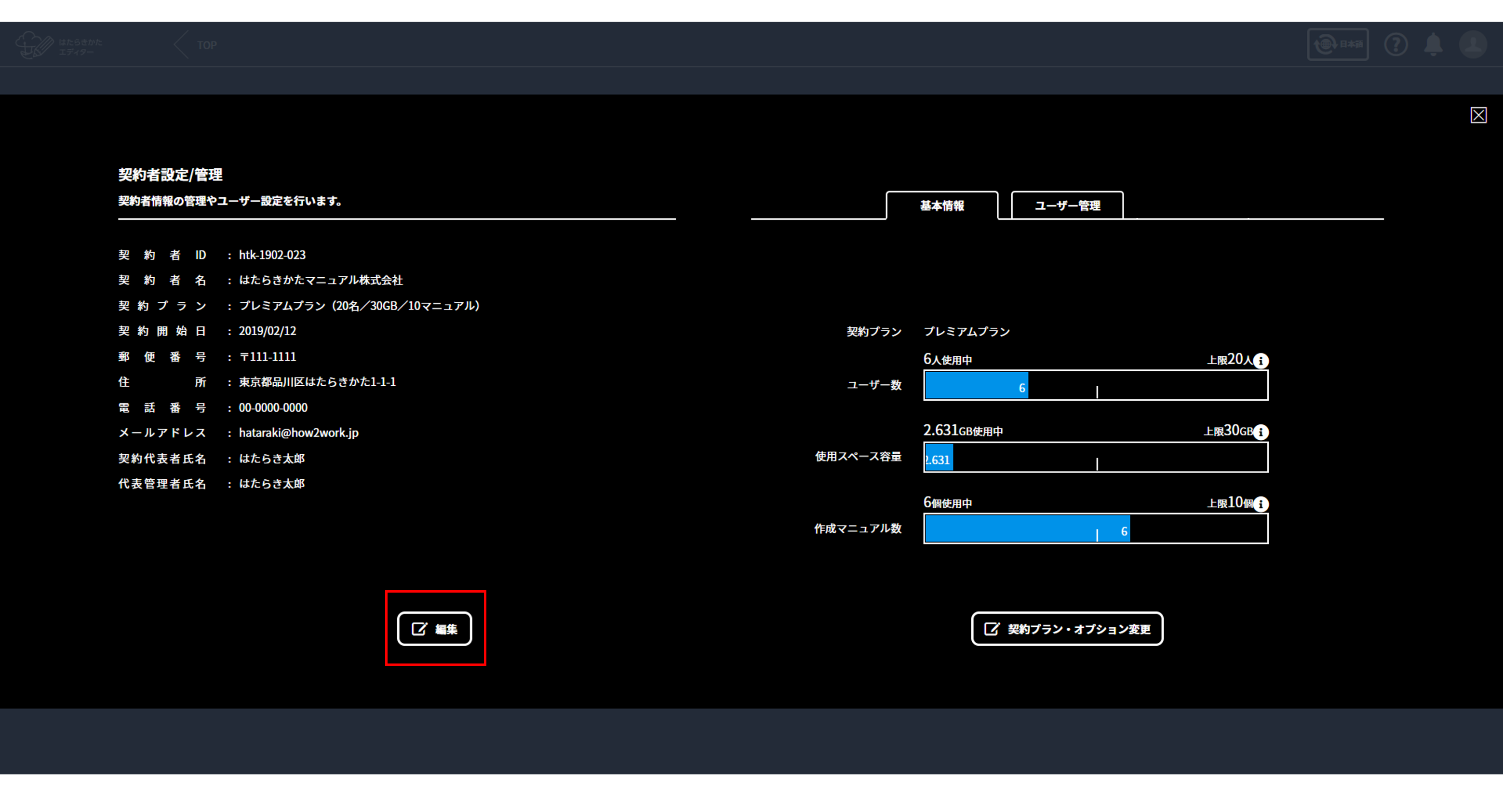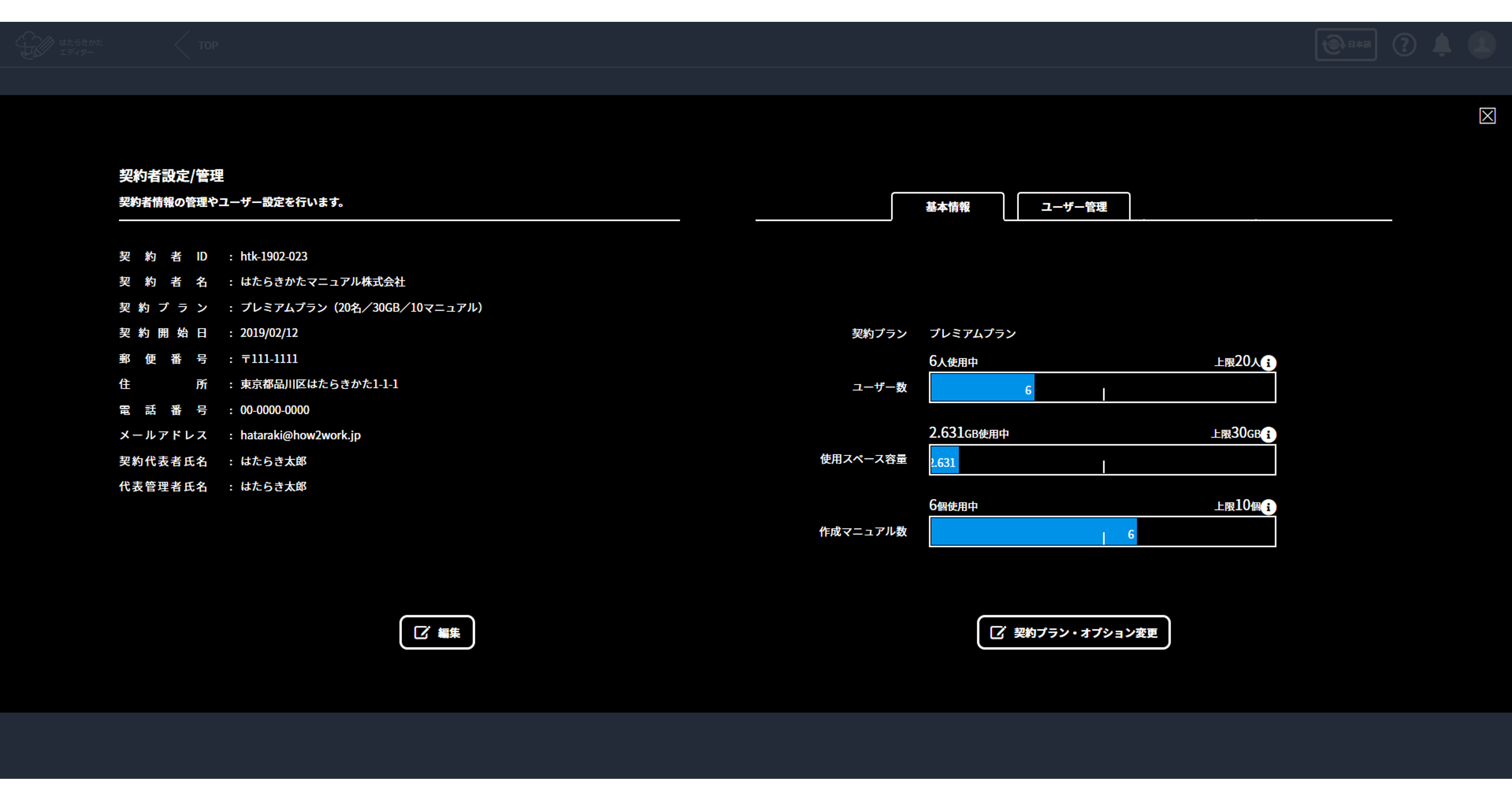 契約プラン・登録済みのユーザー数やマニュアル数・使用容量など、はたらきかたエディターの契約内容を確認します。