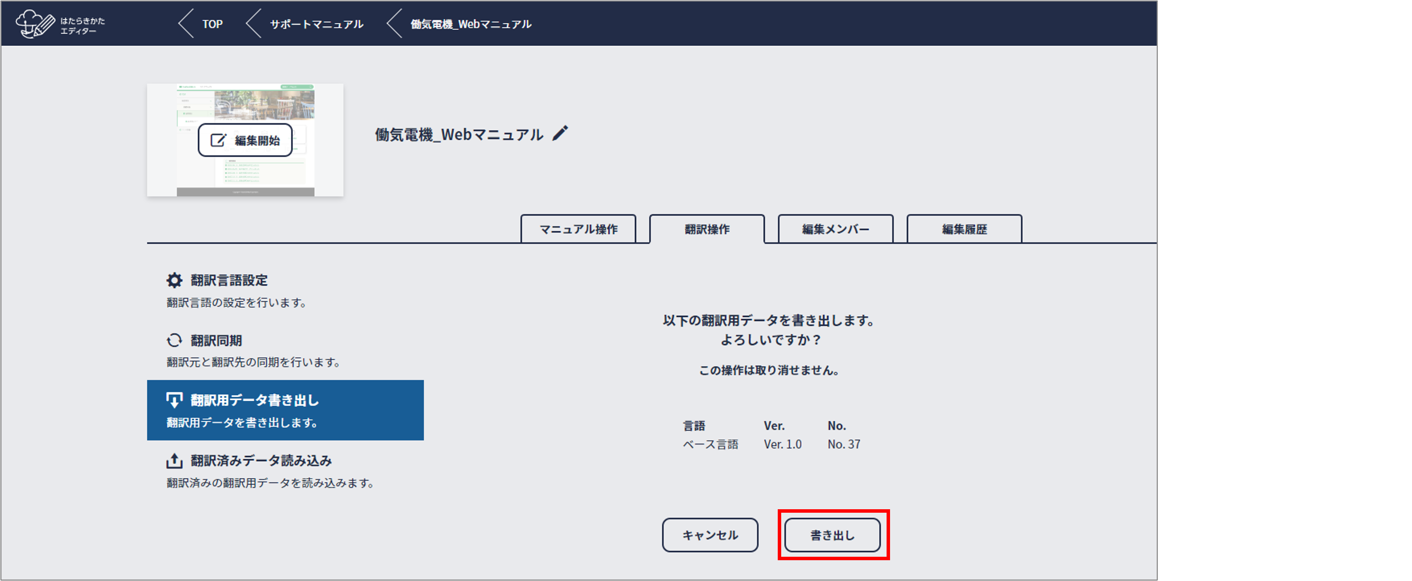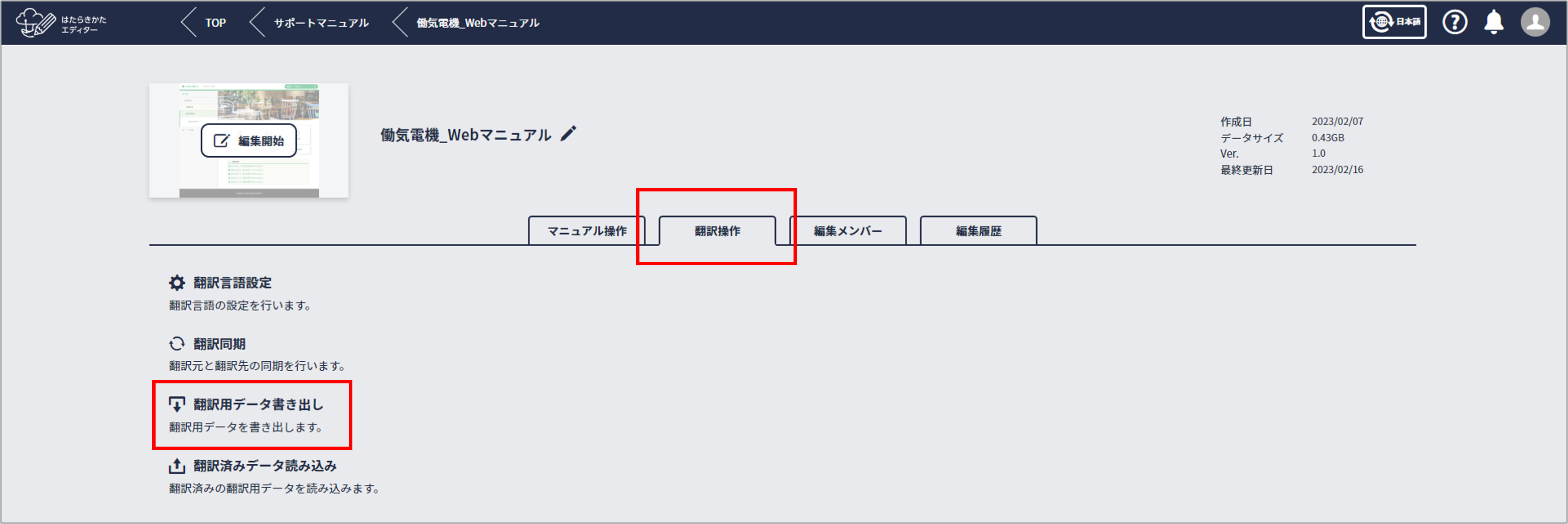[翻訳操作]をクリックし、[翻訳用データ書き出し]をクリックする